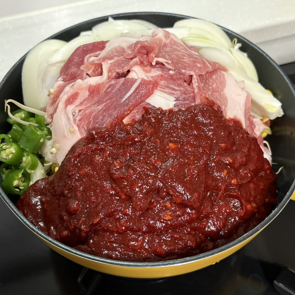 재료: 돼지불고기(대패삼겹가능!) 300g, 콩나물, 양파, 깻잎, 다진마늘, 청양고추, 고추장, 고춧가루, 설탕, 간장, 맛술, 물엿