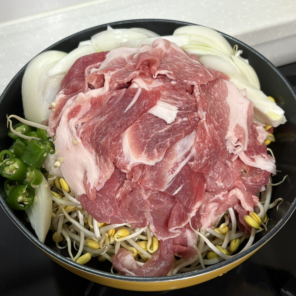- 콩나물 300g, 고기300g (더 넣어도 됩니다!), 양파 반개, 청양고추 한개