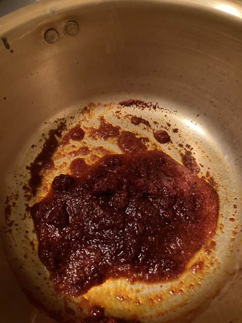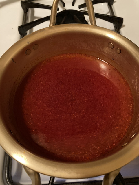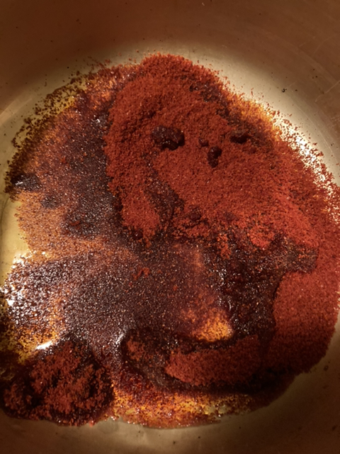 1. 냄비에 참기름 한스푼, 식용 기름 한스푼, 고춧가루 두스푼을 넣고 약불에 살살 볶는다.