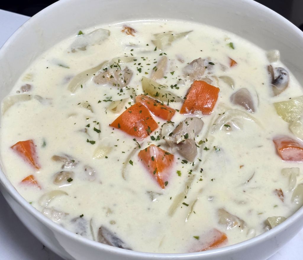 5. !!!!!굽던 팬에!!!!!! 밀가루 4숟가락을 우유에 풀어서 넣고(우유 다 부어버려), 생크림, 월계수잎 1개, 설탕 0.3숟가락, 준비한 모든 야채, 치킨스톡 2숟가락 넣고 긁어주면서 끓이기
