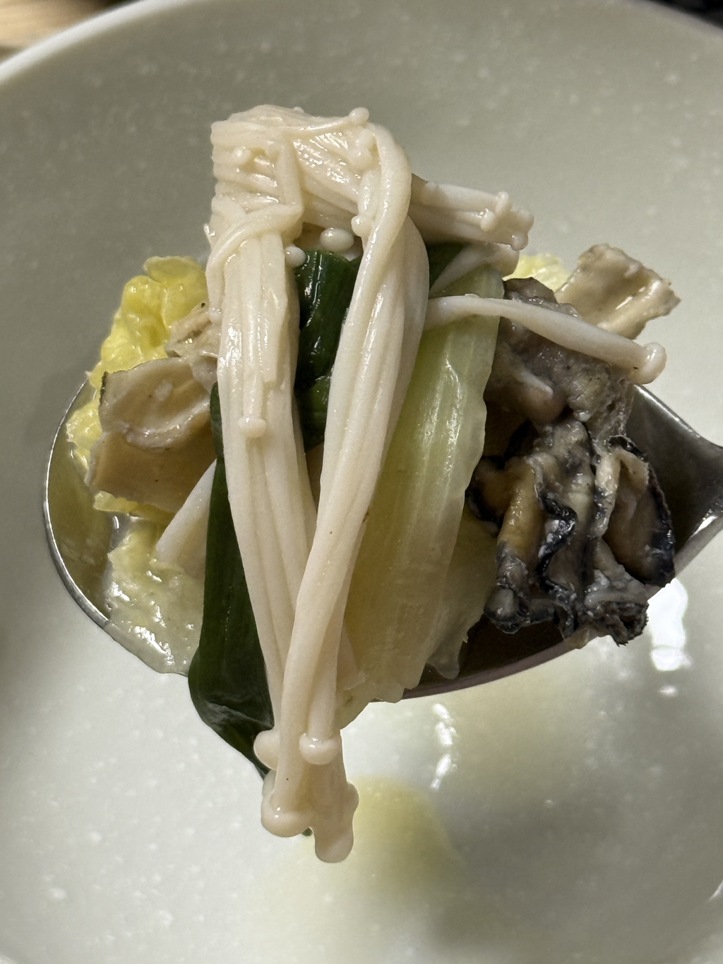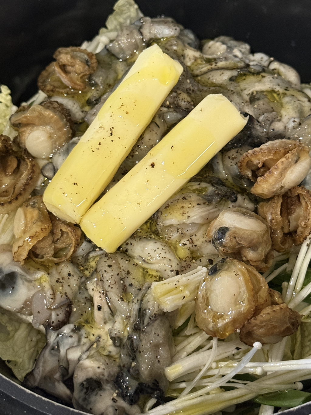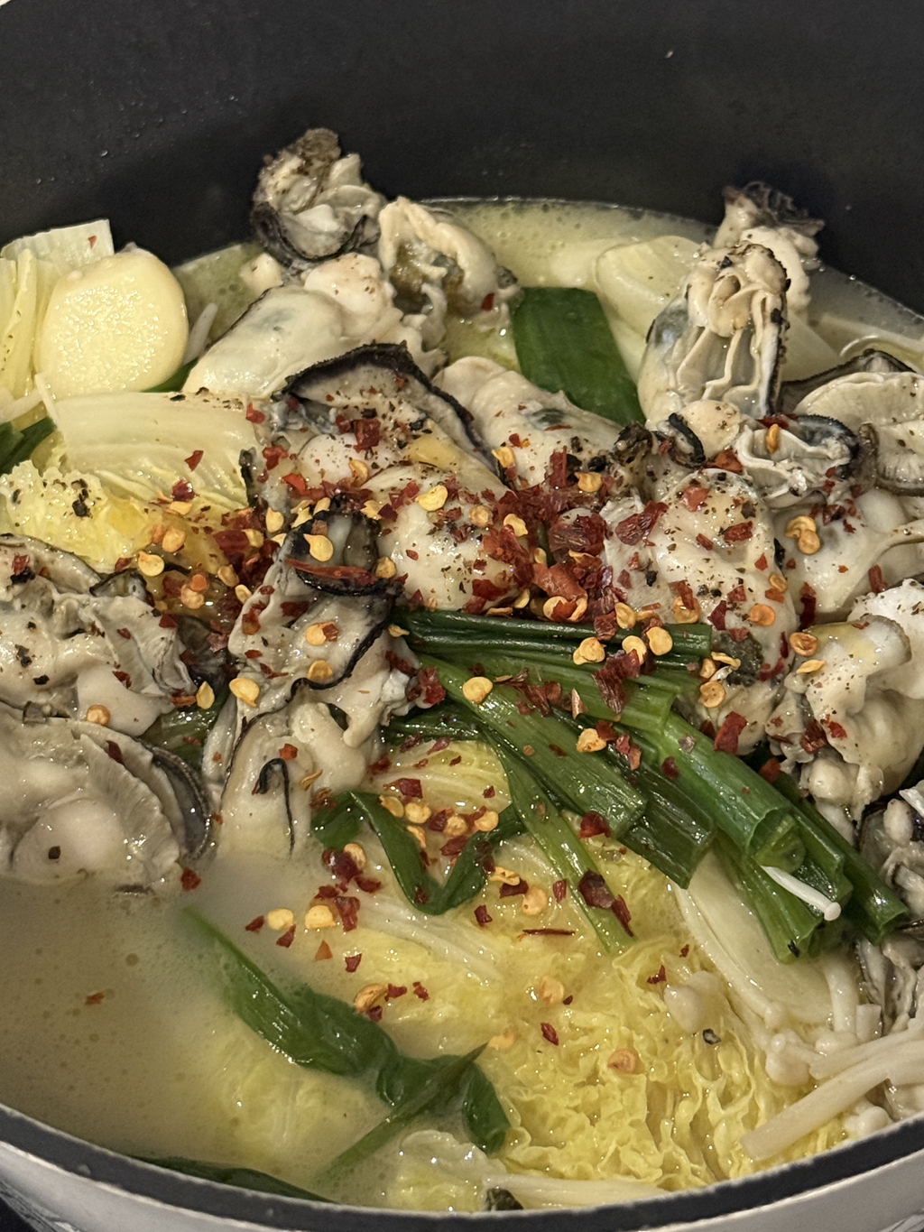 재료-내가 좋아하는 야채(알배추,쪽파,편마늘,팽이버섯 등등), 소금, 후추, 굴, 치킨스톡, 청양고추or레드페퍼,버터2조각,올리브유