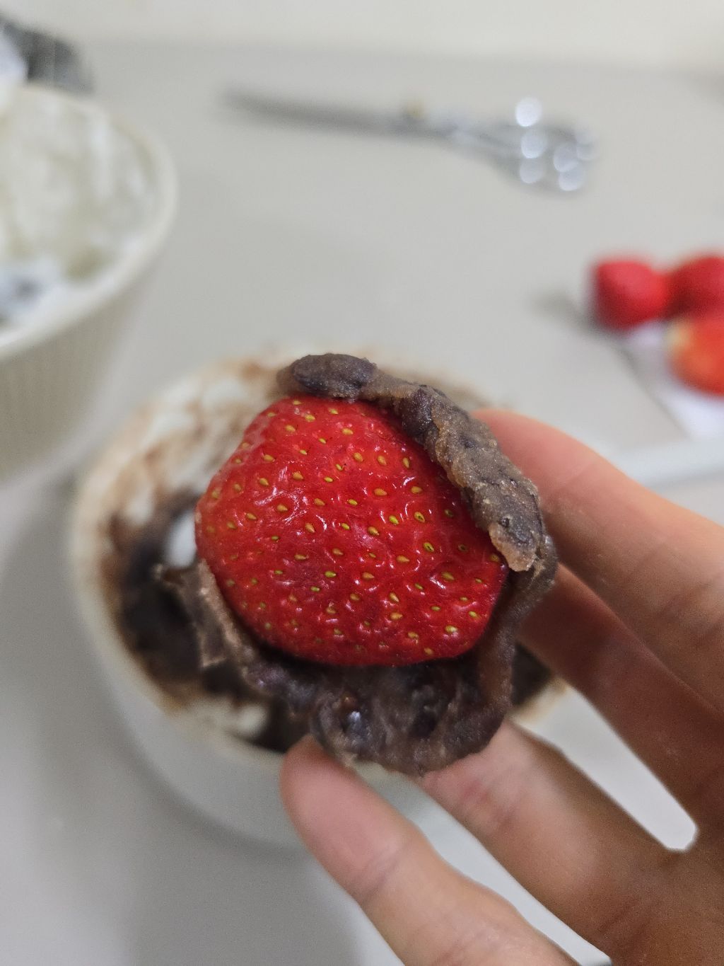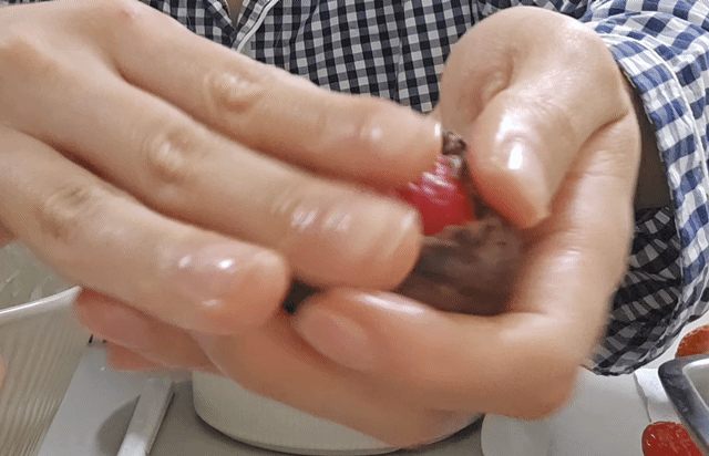 딸기를 감싼 팥덩어리를 넣고 모양 만들어.