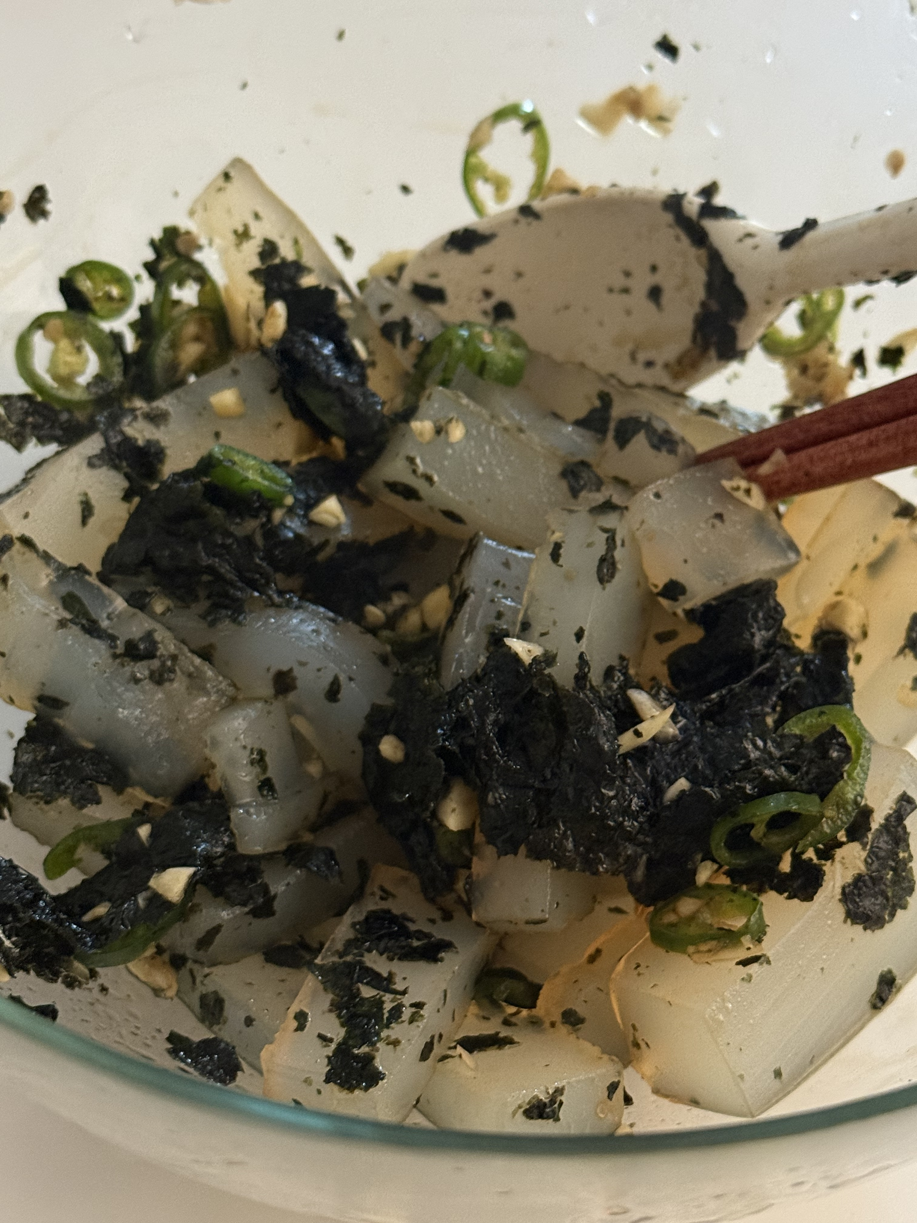 - 이래야지 양념이 청포묵에 쫘압 달라붙어. 이 상태로 체반에 잠시 대기