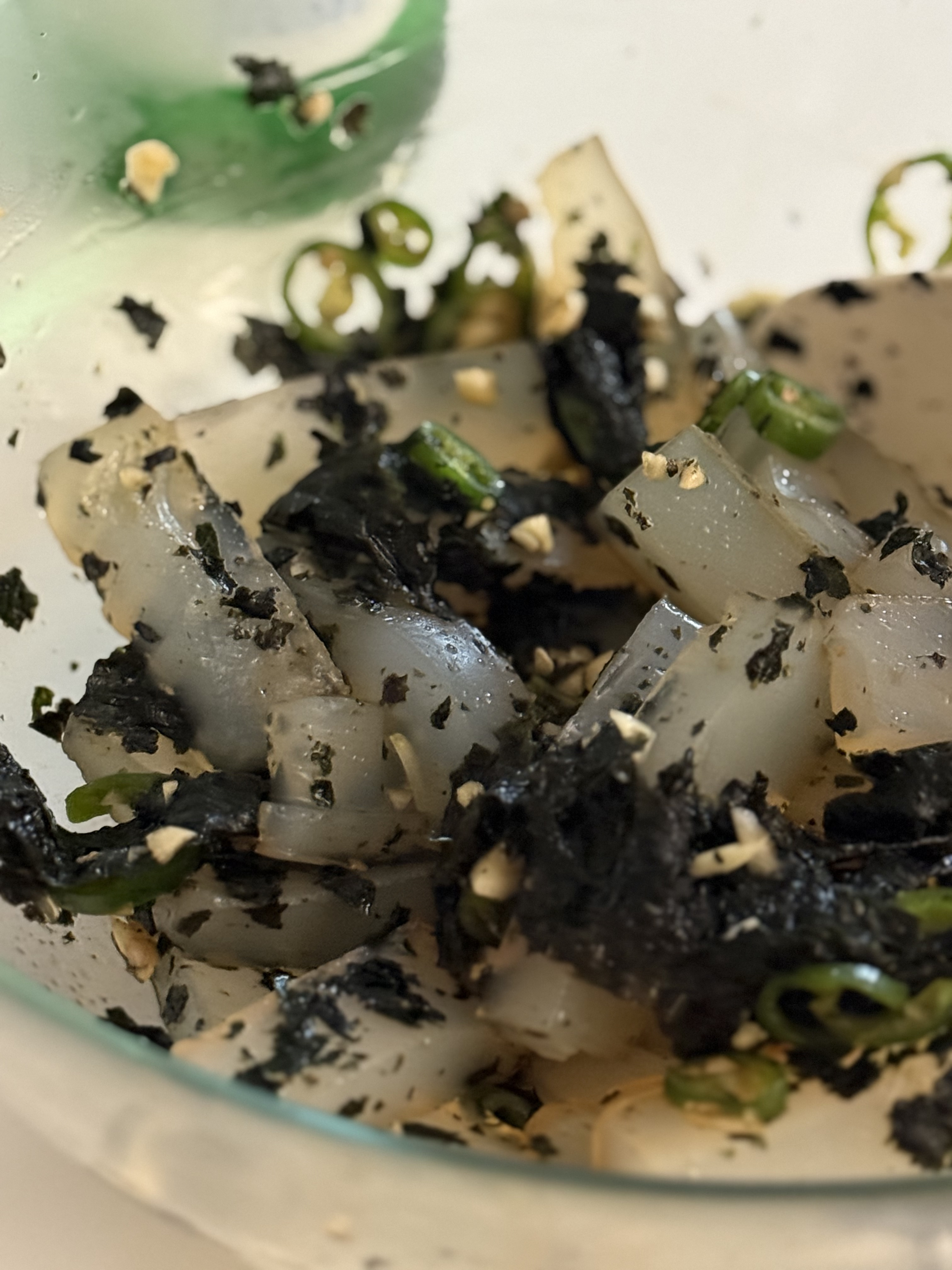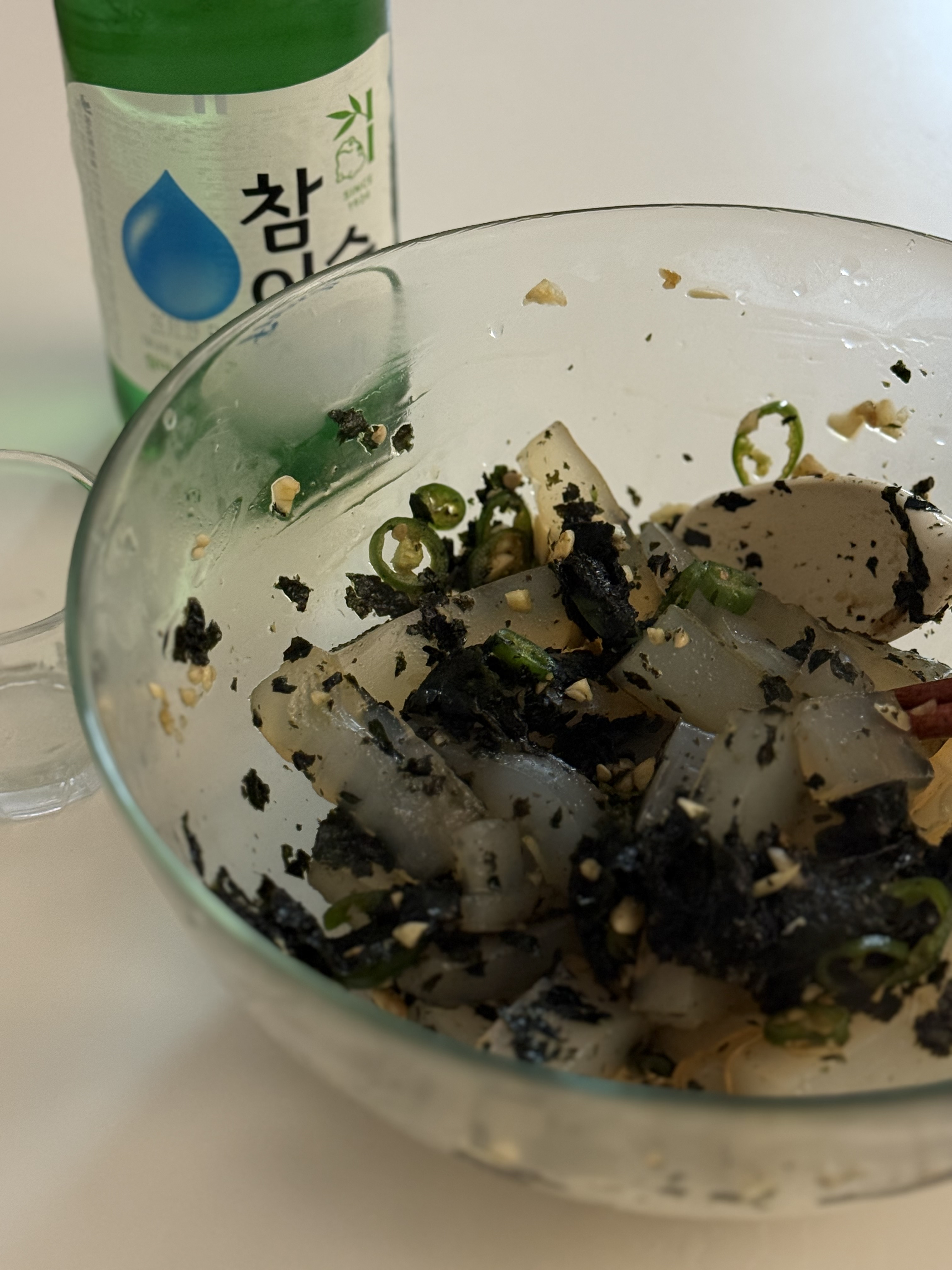 - 썰어서 데치는 걸 추천! 끓이다보면 하얀색이던 청포묵이 투명해지는게 보여 그럼 그때 쯤 건지면 돼 (대략 3분)