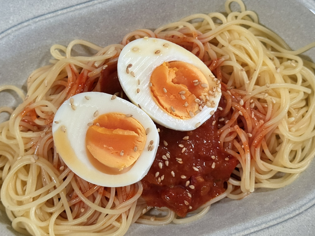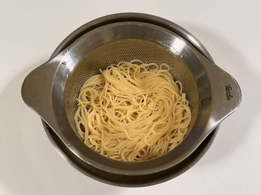 스파게티면은 너무 두꺼울 것 같긴 한데 새로운 면 사기는 좀 그렇고 한번 해먹어보는 정도라면 그냥 스파게티면 써도 무방할거같애! 그대신 면을 푹~~ 삶아야 함. 파스타 봉지에 10분 써있다면 적어도 12분 이상은 삶아야 찬물에 헹궜을때 딱딱해지지 않음!
