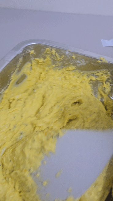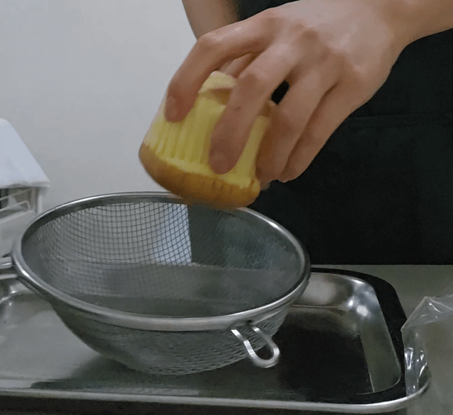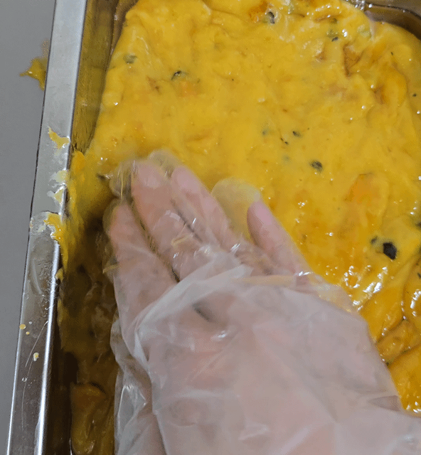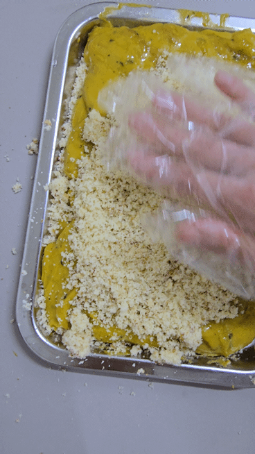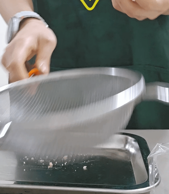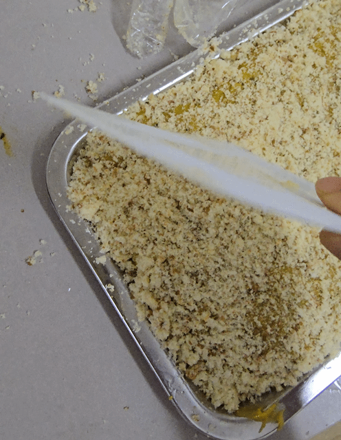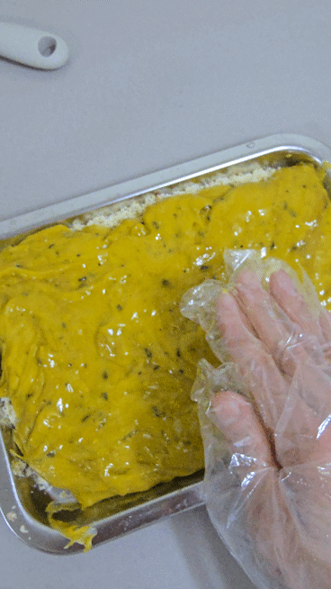 2-1. 쟁반에 카스테라가루를 꼼꼼히 펼침