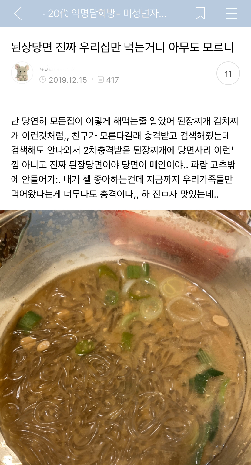 된장당면을 우리집만 먹는다는 소식에 충격받아 익담에 썼더니 아무도 모른대서 충격 약 두달반동안 충격에 잠겨있다가 이제서야 막생 올림