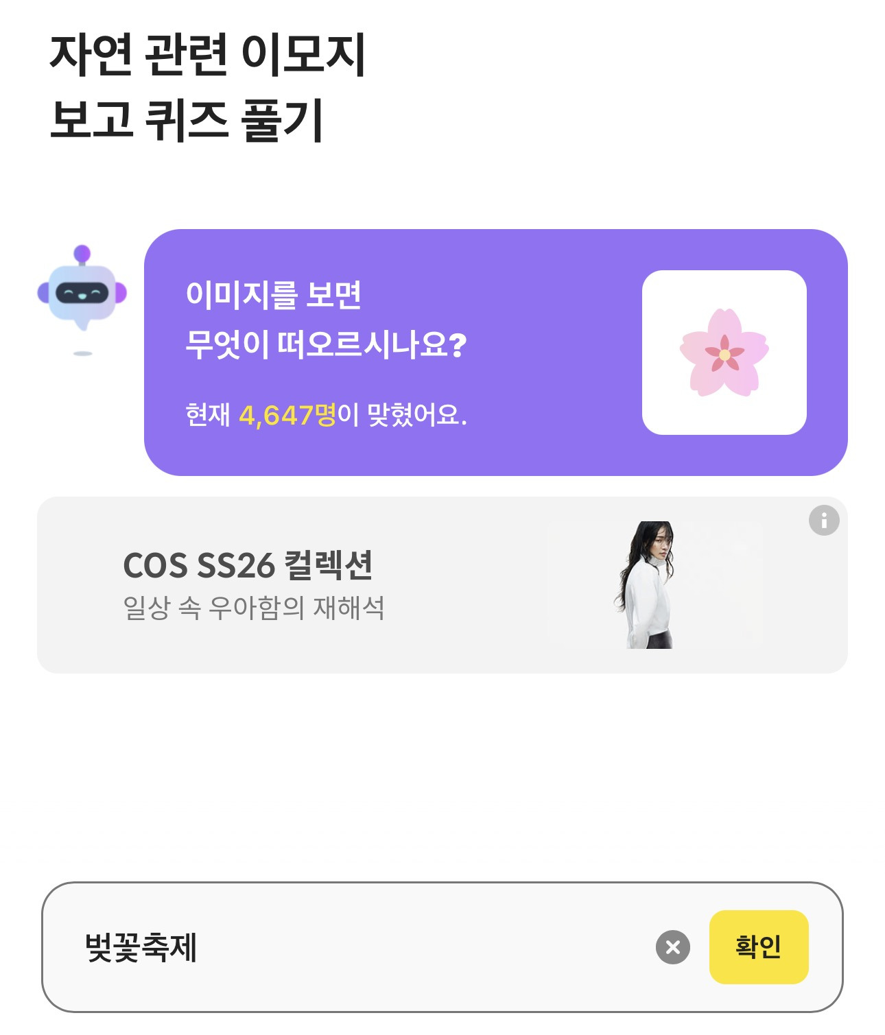 260404 카카오뱅크 Ai 키워드 이모지 퀴즈(~ 11시 59분까지) 작성자스티치주식회사|작성시간26.04.04|조회수1,043 목록 댓글 12 글자크기 작게가 글자크기 크게가 출처 : 여성시대 스티치주식회사카카오뱅크 AI 키워드퀴즈https://kakaobank.onelink.me/0qMi/jcwk0sbz카카오뱅크나의 첫 번째 AI 은행kakaobank.onelink.me정답 - 벚꽃축제 다음검색 현재 게시글 추가 기능 열기 북마크 공유하기 신고 센터로 신고 댓글 댓글 12 댓글쓰기 답글쓰기 댓글 리스트 작성자장민제 | 작성시간 26.04.04 오늘은 억지아니네 작성자코코코코코넛 | 작성시간 26.04.04 고마워! 작성자수고했어오늘도오 | 작성시간 26.04.04 고마워! 작성자22.8세 | 작성시간 26.04.04 고마워 😊 작성자다이다이 | 작성시간 26.04.04 고마워! 댓글 전체보기
