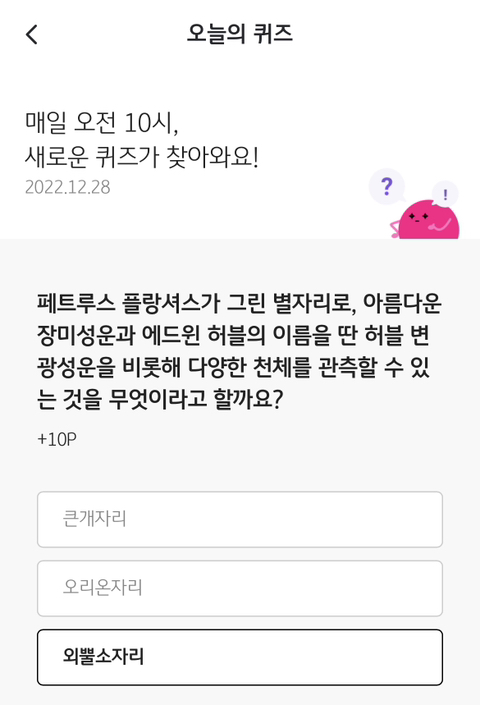 [12/28] KB Pay(리브메이트) 오늘의퀴즈 정답 작성자부자가꿈인거지|작성시간22.12.28|조회수2,827 목록 댓글 15 글자크기 작게가 글자크기 크게가 출처 : 여성시대 부자가꿈인거지 정답 : 외뿔소자리 춥다 추워 옷 따숩게 입어! 수요팅🤍 다음검색 현재 게시글 추가 기능 열기 북마크 공유하기 신고 센터로 신고 댓글 댓글 15 댓글쓰기 답글쓰기 댓글 리스트 작성자초당강 | 작성시간 22.12.28 고마워!! 작성자별게 다 설치네 | 작성시간 22.12.28 항상 고마워~ 작성자퇴근시간 | 작성시간 22.12.28 고마워! 작성자아갈다이어터 | 작성시간 22.12.28 고마워!!! 작성자야루룰루루 | 작성시간 22.12.28 고마워~! 댓글 전체보기