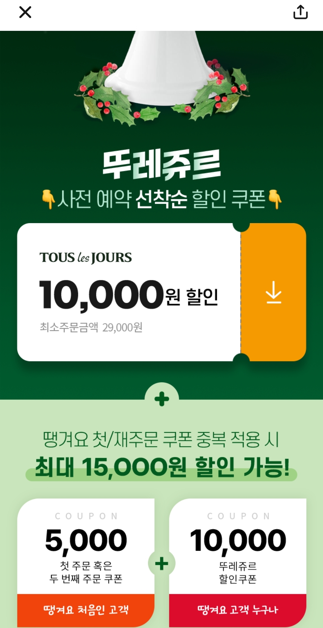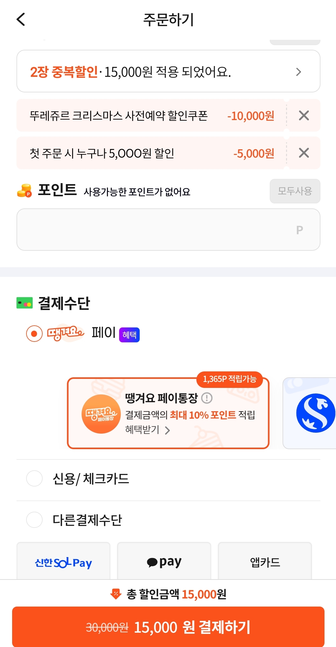 첫주문 대상이고, 중복 적용하면 총 15000원 할인됨