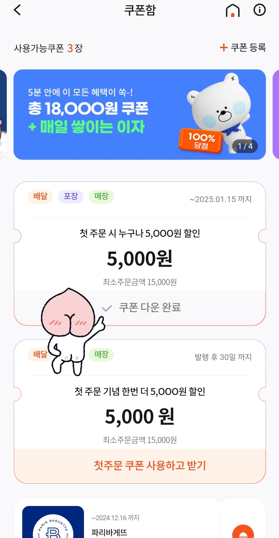 2) 뚜레쥬르나 파리바게트 예약하고싶은곳 들어가서 쿠폰 다운