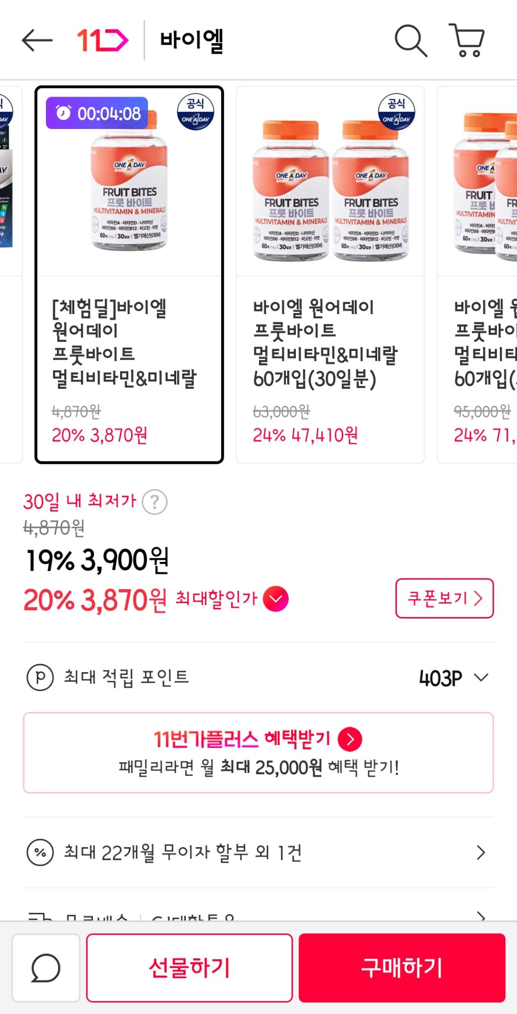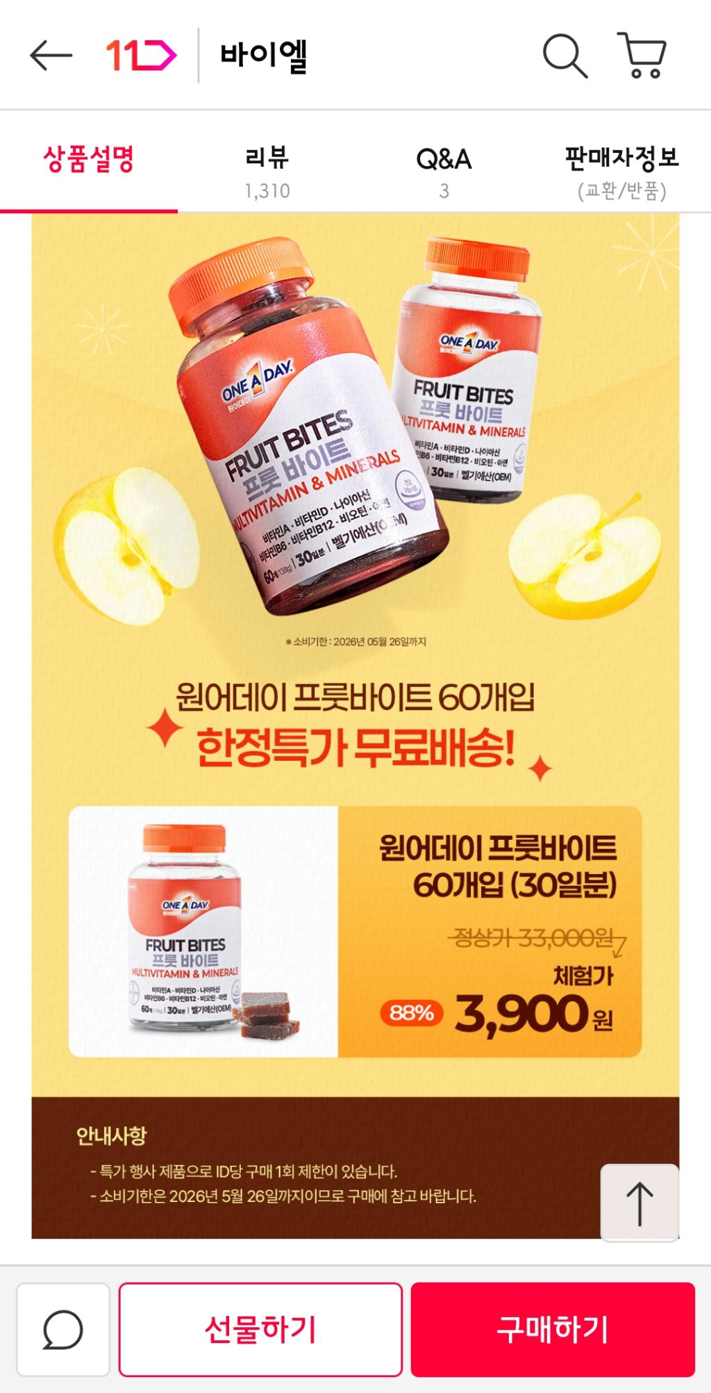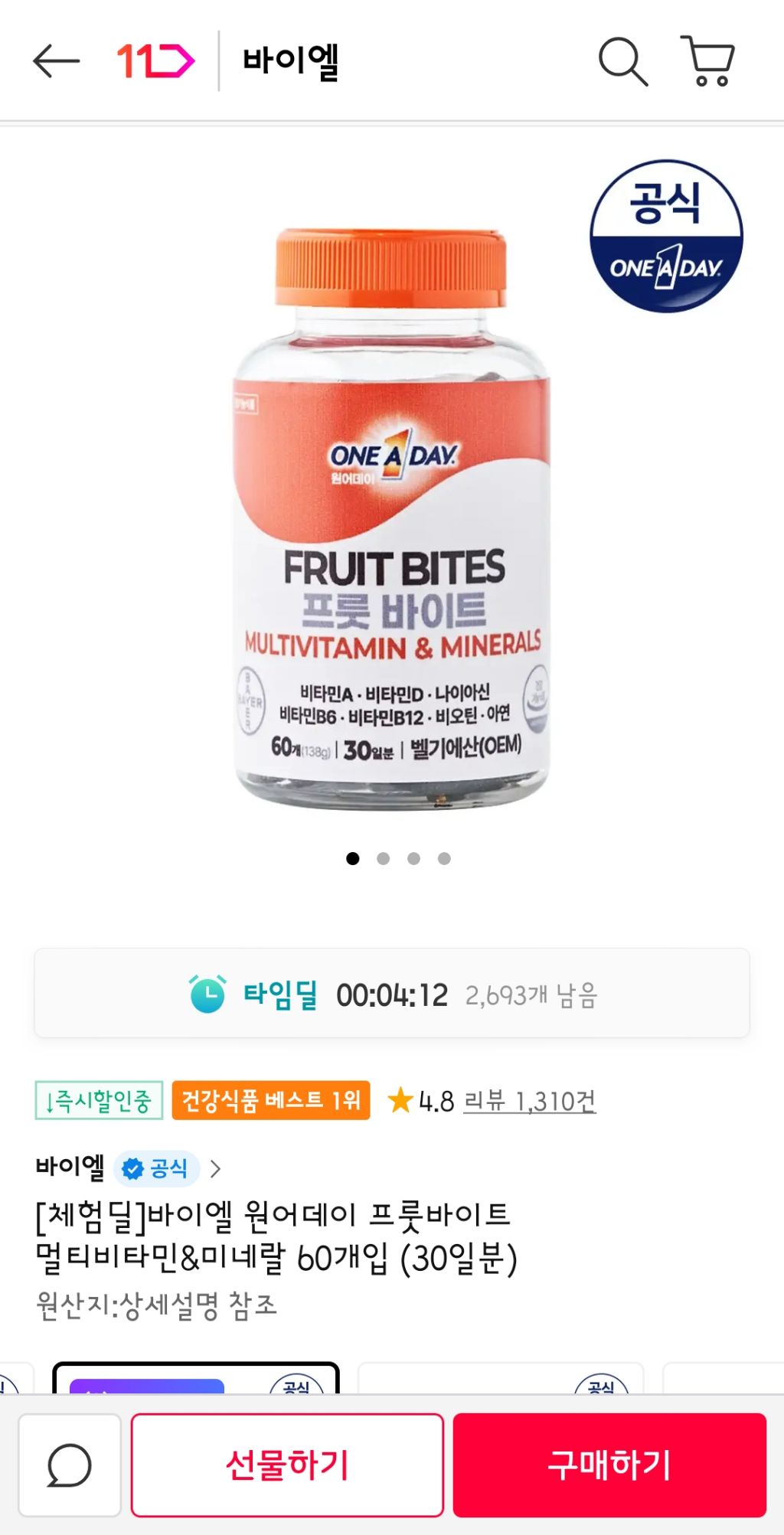 끝ㅠㅠ]]]]3분남음 멀티비타민 30일치 3900원무배 달려->4600원 작성자달콤한미꾸라지|작성시간25.09.02|조회수3,724 목록 댓글 21 글자크기 작게가 글자크기 크게가 출처: 여성시대 달콤한미꾸라지http://www.11st.co.kr/products/7773827706/share[11번가] [체험딜]바이엘 원어데이 프룻바이트 멀티비타민&미네랄 60개입 (30일분)카테고리: 멀티비타민/미네랄, 가격 : 3,900원www.11st.co.kr월루하다가 11번가 베스트1위길래일단들고와봤어 다음검색 현재 게시글 추가 기능 열기 북마크 공유하기 신고 센터로 신고 댓글 댓글 21 댓글쓰기 답글쓰기 댓글 리스트 답댓글 작성자달콤한미꾸라지 작성자 본인 여부 작성자 | 작성시간 25.09.02 응ㅠㅠ 작성자큱개옪다 | 작성시간 25.09.02 하...늦엇다..ㅠ 작성자마까롱 | 작성시간 25.09.02 머야 이거 조은거야? ㅋㅋ 작성자빵사세여 | 작성시간 25.09.02 아까 일하다가 바로 결제했었다ㅋㅋ알려줘서 고마워!! 작성자뮤겟바닐라 | 작성시간 25.09.03 아나 여기꺼 먹는데ㅜㅜ 댓글 전체보기