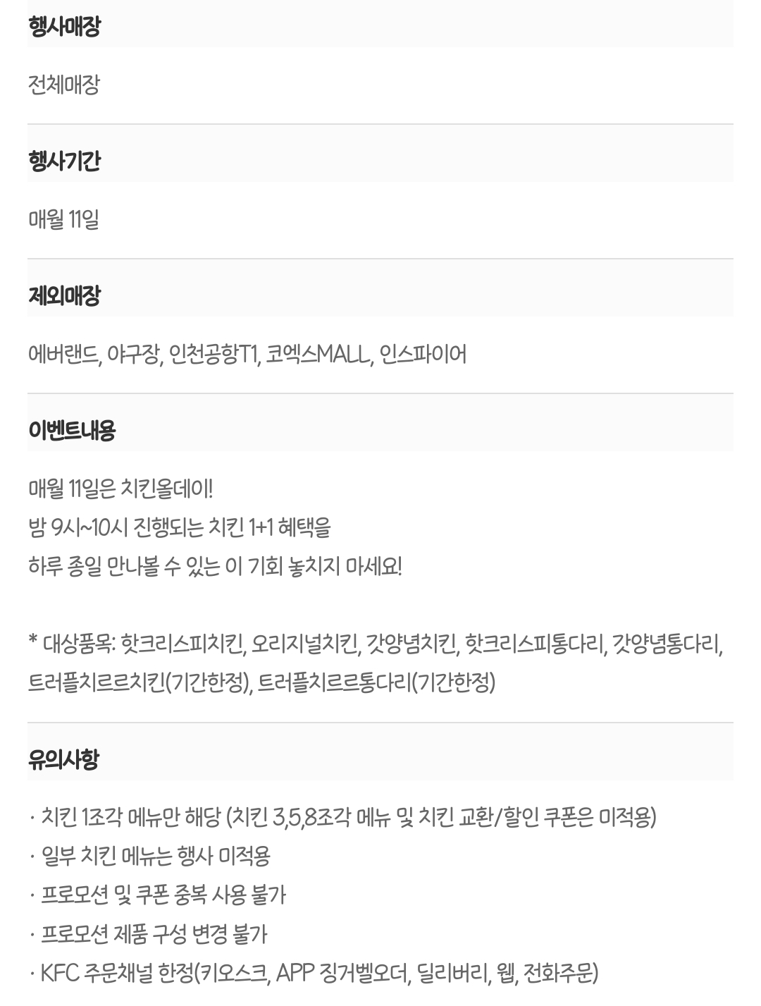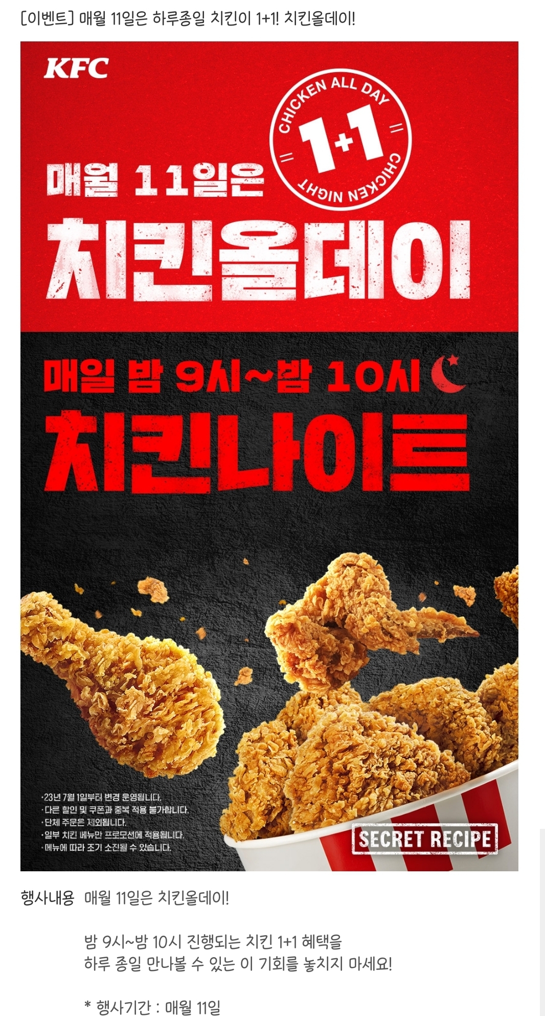 매월 11일은 KFC 치킨올데이! 하루종일 치킨 1+1 작성자과메기처돌이|작성시간25.11.11|조회수7,840 목록 댓글 29 글자크기 작게가 글자크기 크게가 출처: 여성시대 과메기처돌이https://www.kfckorea.com/promotion/promotionList/detail/955 다음검색 현재 게시글 추가 기능 열기 북마크 공유하기 신고 센터로 신고 댓글 댓글 29 댓글쓰기 답글쓰기 댓글 리스트 작성자초기화기본 | 작성시간 25.11.11 고마워 오늘 간다 작성자어니부기. | 작성시간 25.11.11 시간상관없는거야??? 답댓글 작성자공오공오 | 작성시간 25.11.11 글에 하루종일이라고 적혀있엉 작성자말차구름 | 작성시간 25.11.11 아 맞다 작성자오늘. | 작성시간 25.11.11 대기시간 진짜 개오바였음 ㅠㅠ 댓글 전체보기