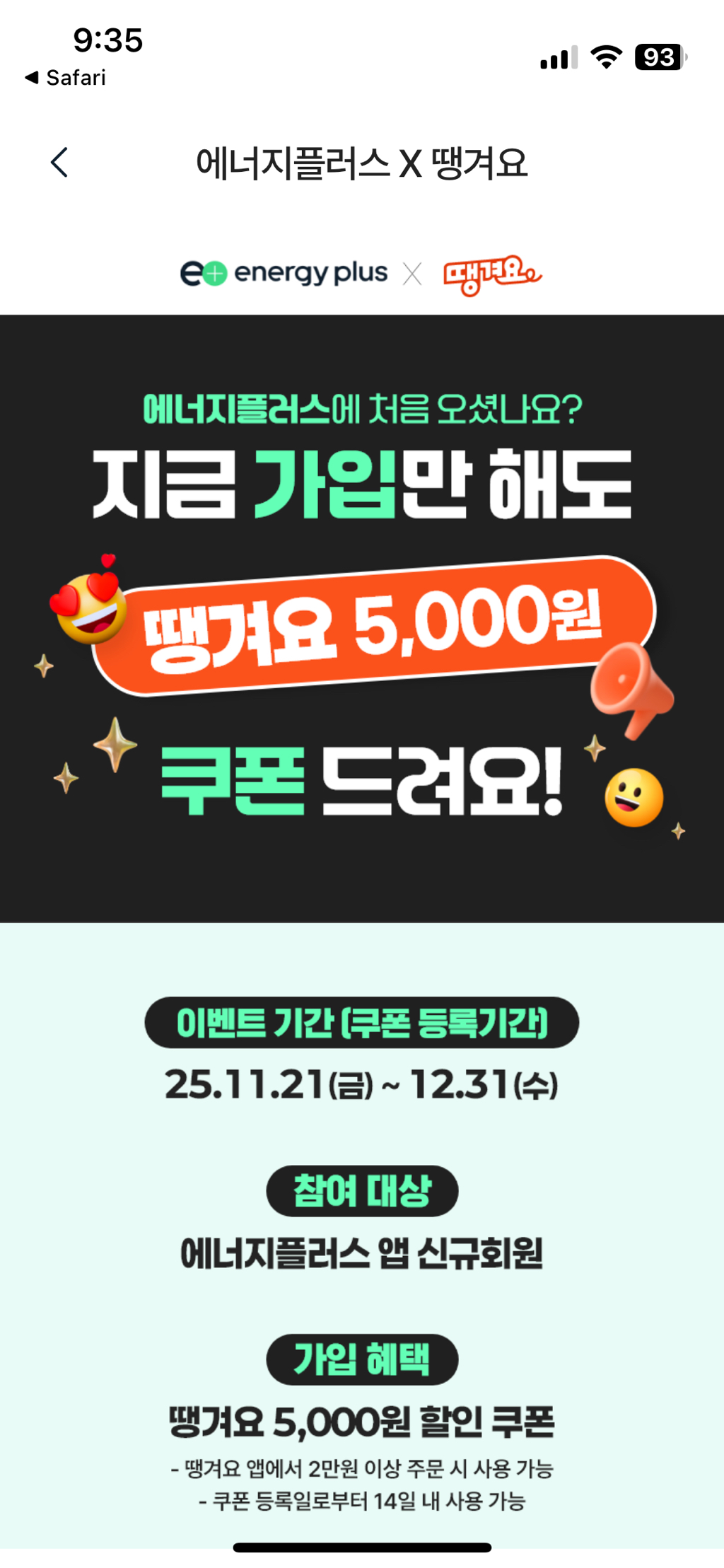 땡겨요 X GS에너지플러스 가입 시 5천쿠 작성자반지|작성시간25.11.21|조회수2,712 목록 댓글 6 글자크기 작게가 글자크기 크게가 출처: 여성시대 반지5,OOO원 할인쿠폰 즉시 지급! https://fdofd.ddangyo.com/gateway4.html?95KSB4p너도 살고 나도 사는 우리동네 배달앱 땡겨요'나는 지금 이게 땡겨요' 우리동네 배달앱 '땡겨요' 앱에서 확인해보세요.fdofd.ddangyo.com 다음검색 현재 게시글 추가 기능 열기 북마크 공유하기 신고 센터로 신고 댓글 댓글 6 댓글쓰기 답글쓰기 댓글 리스트 작성자행운의°여신 | 작성시간 25.11.21 탈퇴하고 재가입하면 주나..?탈퇴하고 재가입해도 안주네..ㅜㅋㅋ 작성자짜파구리구리구리 | 작성시간 25.11.21 고마워!! 작성자영화할인권 | 작성시간 25.11.21 받았다 땡큐~~ 작성자뚜비쓰 | 작성시간 25.11.22 가입하는데 비밀번호 설정 너무 까다로운데 나만 그래?ㅠ 어떻게 입력해도 안돼서 빡치네ㅜ 작성자냥멍이들아사랑해 | 작성시간 25.11.23 왜 안주지응 근데 안되네 ㅎㅎ 내가 뭐 잘못했나봐 탈퇴함 ㅋㅋ 댓글 전체보기