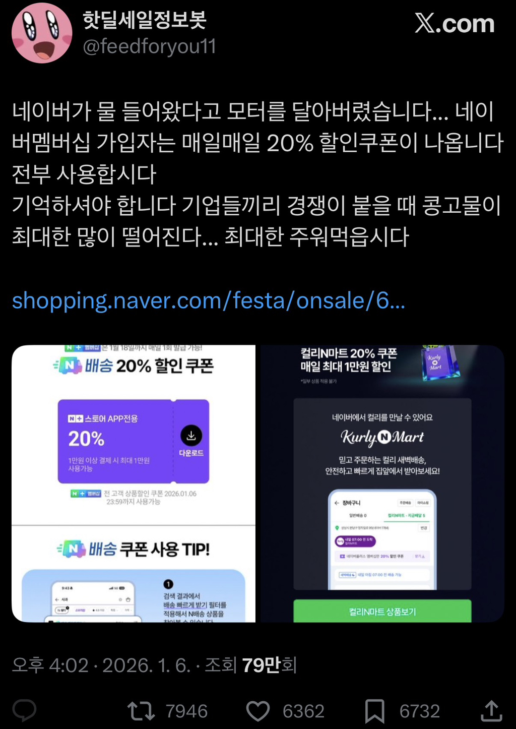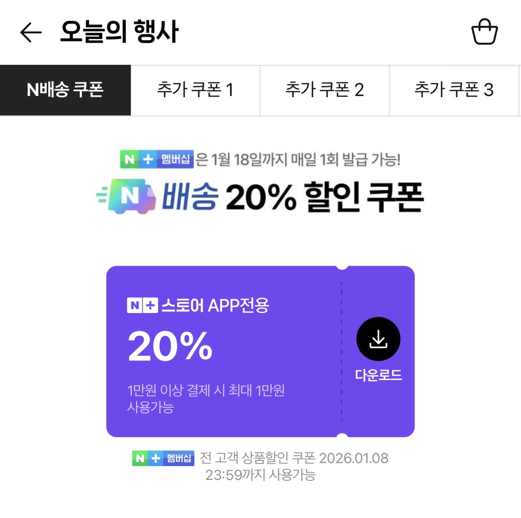 [스크랩] 네이버 멤버쉽 가입자 매일 20% 할인 쿠폰 발급 작성자범죄자반갈죽|작성시간26.01.10|조회수111,595 목록 댓글 1,270 글자크기 작게가 글자크기 크게가 출처: https://x.com/feedforyou11/status/2008433864042250320?s=46&t=e6wG374kA7MHp9poqfsukAhttps://naver.me/5norEe7s프로모션 : 네이버+ 스토어놓칠 수 없는 풍성한 혜택과 다양한 상품이 가득한 지금!shopping.naver.com 다음검색 스크랩 원문 : *여성시대* 차분한 20대들의 알흠다운 공간 현재 게시글 추가 기능 열기 북마크 공유하기 신고 센터로 신고 댓글 댓글 1,270 댓글쓰기 답글쓰기 댓글 리스트 작성자오소리불주먹 | 작성시간 26.01.20 씌앙 ㅜ 작성자모범택시김도기기사 | 작성시간 26.01.20 ..오늘에서야 살 걸 발견했는데..... 이걸 놓치다니 작성자나일론 머스크 | 작성시간 26.01.20 헐.. 이런게 있었다니 작성자3월가보자고 | 작성시간 26.01.21 힌번 더해줘 작성자레노마 | 작성시간 26.01.21 또 하는거 없지?ㅠㅠ 네이버할인 댓글 전체보기