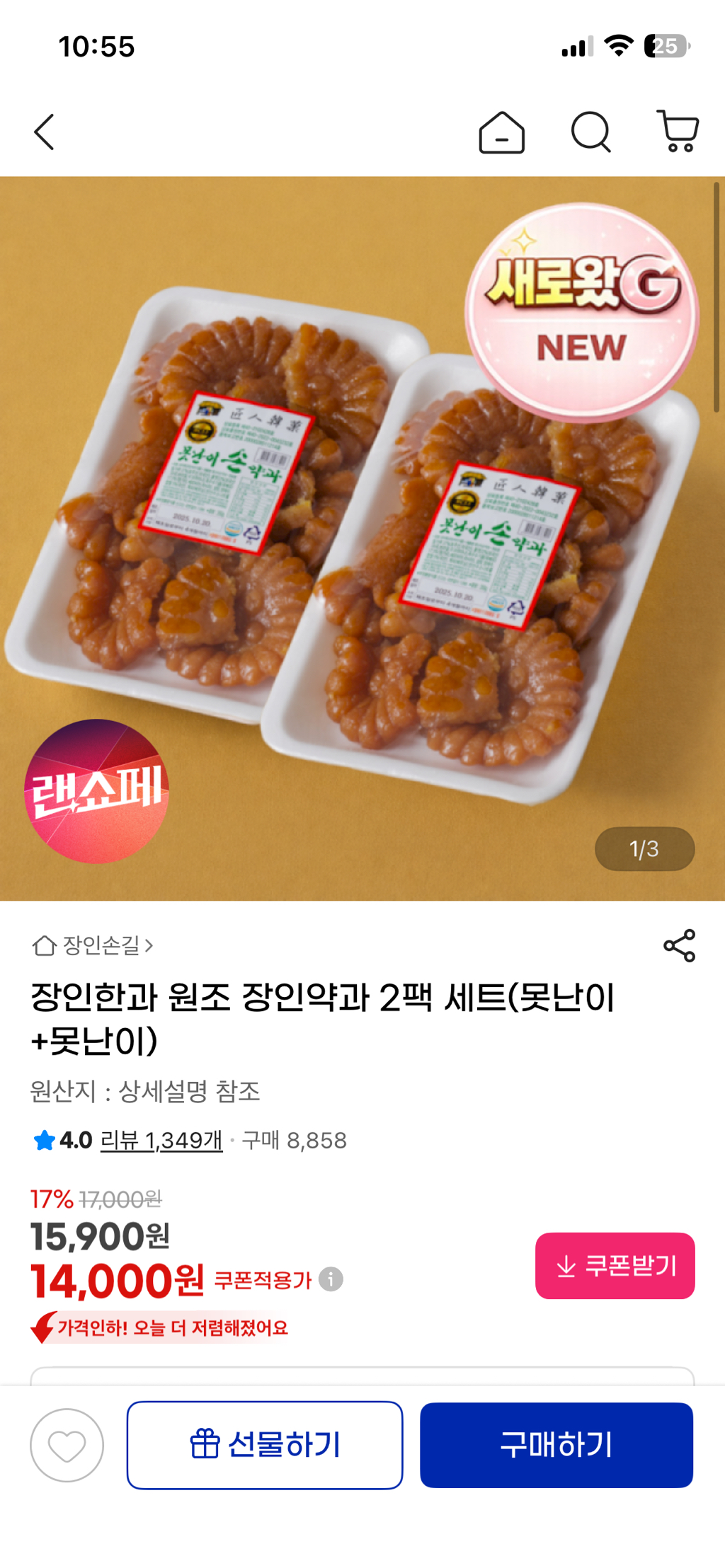 지마켓 장인약과 못난이2팩 14,000원 작성자퍁맽|작성시간26.03.30|조회수4,102 목록 댓글 21 글자크기 작게가 글자크기 크게가 출처: 여성시대 퍁맽장인약과 2팩에 14,000원!!못난이=파지이고 파지가 진짜 바삭쫀쫀하니 맛있음!!!https://link.gmarket.co.kr/TbzhPsbmLi 다음검색 현재 게시글 추가 기능 열기 북마크 공유하기 신고 센터로 신고 댓글 댓글 21 댓글쓰기 답글쓰기 댓글 리스트 작성자빈교실 | 작성시간 26.03.31 파지 시켜서 맛만 본다고 뜯었다가 그 자리에서 한팩 다 먹음 진짜 맛있어 작성자엳이 | 작성시간 26.03.31 샀어.. 얼마나 맛있을까.. 작성자푸우린 | 작성시간 26.04.01 한개 먹어봤을때 그냥그랬는데 계속 올라와서 궁금해서 사봤다배송 오래 걸릴줄 알았는데 오늘 오네! 작성자로또1등나 | 작성시간 26.04.01 개맛있덩...쩐내 안내고 바삭해 작성자냔냔고릴 | 작성시간 26.04.02 개마싯어… 댓글 전체보기