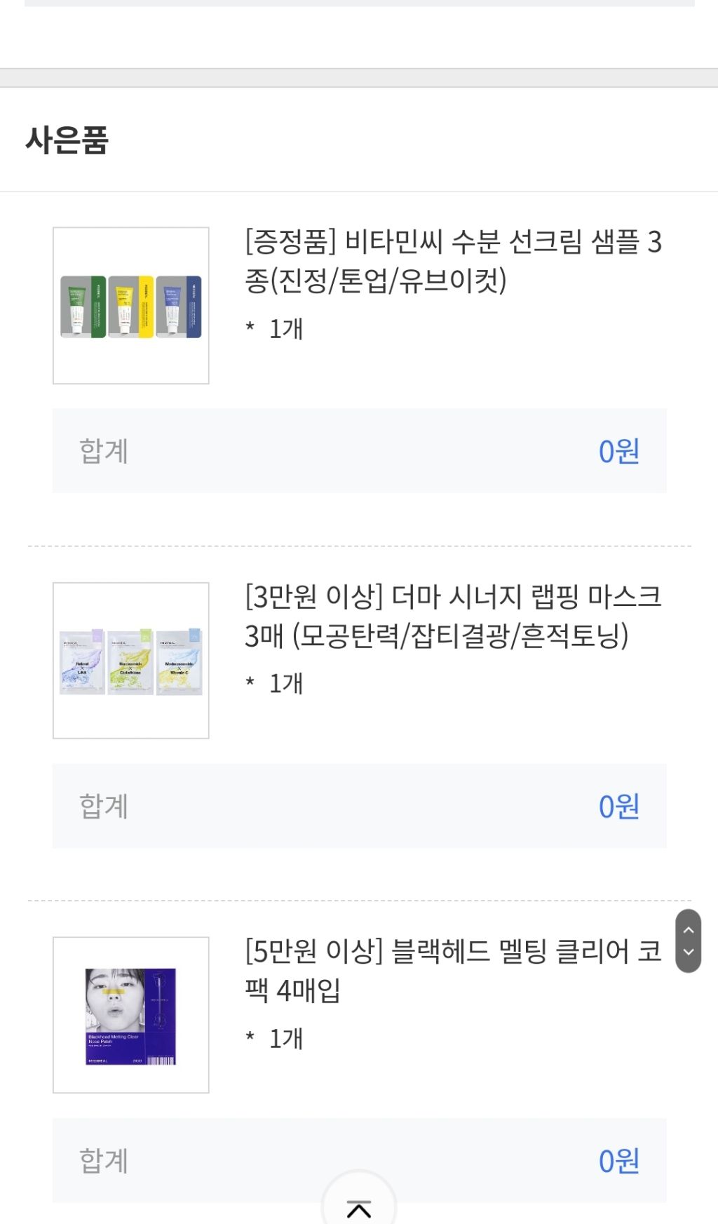 실구매가 5만원 이상시 주는 사은품이 괜찮은거 같아! 팩 3장에 코팩 4개