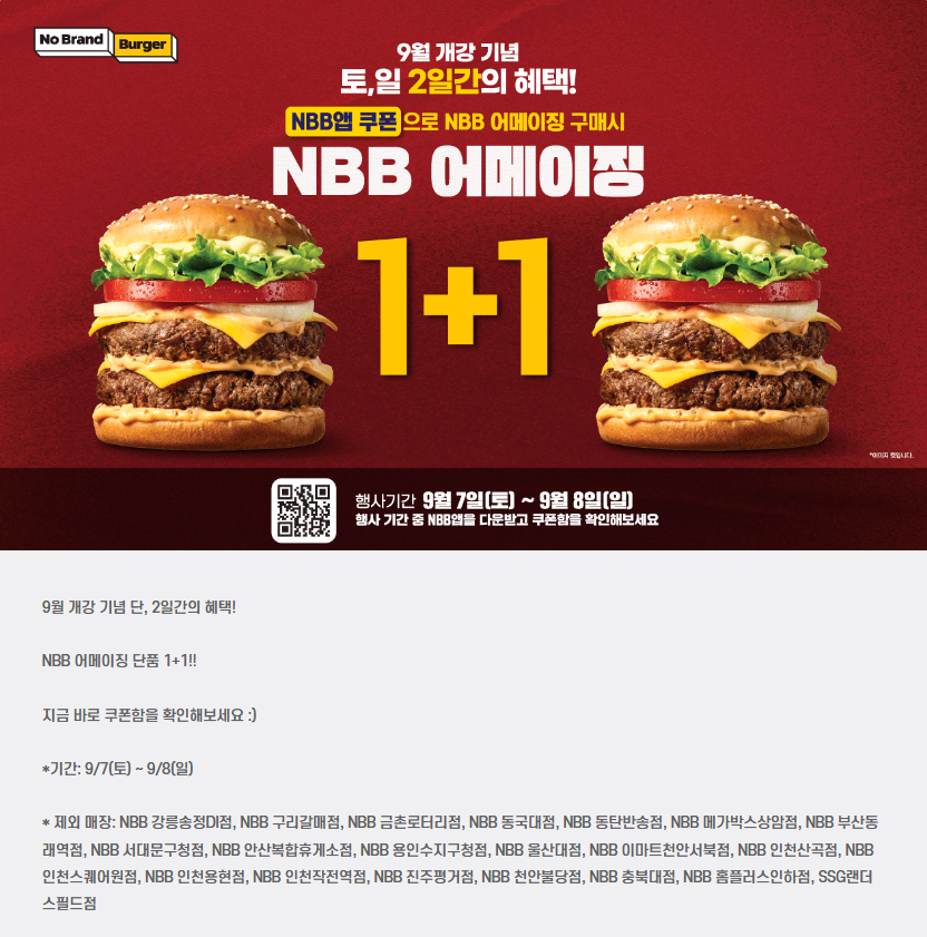 *여성시대* 차분한 20대들의 알흠다운 공간 노브랜드버거 앱 주말특가 NBB 어메이징버거 1+1 작성시간24.09.07|조회수7,541 목록 댓글 3 글자크기 작게가 글자크기 크게가 출처: 여성시대 파란 앱 쿠폰으로 구매해야함 다음검색 현재 게시글 추가 기능 열기 북마크 공유하기 신고 센터로 신고 댓글 3 댓글 리스트 작성시간 24.09.07 오 대박 작성시간 24.09.07 헐 내일 햄버거 먹어야지 고마워! 작성시간 24.09.08 맛나나요.. 다녀옮가 카페 방문해 더 많은 댓글 만나기!