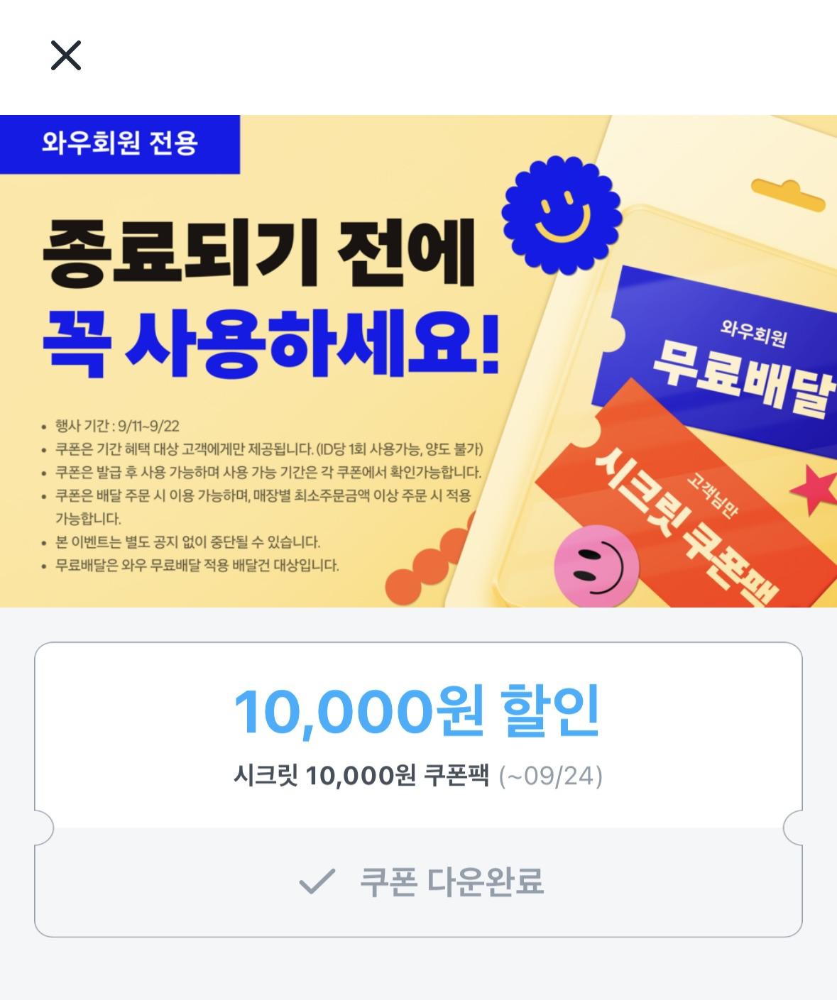 쿠팡이츠 1만원 시크릿쿠폰팩 작성자세계여행|작성시간24.09.18|조회수28,661 목록 댓글 89 글자크기 작게가 글자크기 크게가 출처: 여성시대 세계여행심심해서 들어갔는데 갑자기 주네..?조건도 없음와우회원이면 랜덤으로 주는듯 다음검색 현재 게시글 추가 기능 열기 북마크 공유하기 신고 센터로 신고 댓글 댓글 89 댓글쓰기 답글쓰기 댓글 리스트 작성자소형준 | 작성시간 24.09.20 괘씸한놈덜 작성자뼛속까지 isfp여시 | 작성시간 24.09.20 헐 받음 고마워 작성자다람맘 | 작성시간 24.09.21 망오천원 땡큐 작성자감사한고구마 | 작성시간 24.09.23 받았다 오오 작성자다들켜써 | 작성시간 24.09.26 아 미친 이거 기간 끝났네ㅠ 오천원 남아있었는데 댓글 전체보기