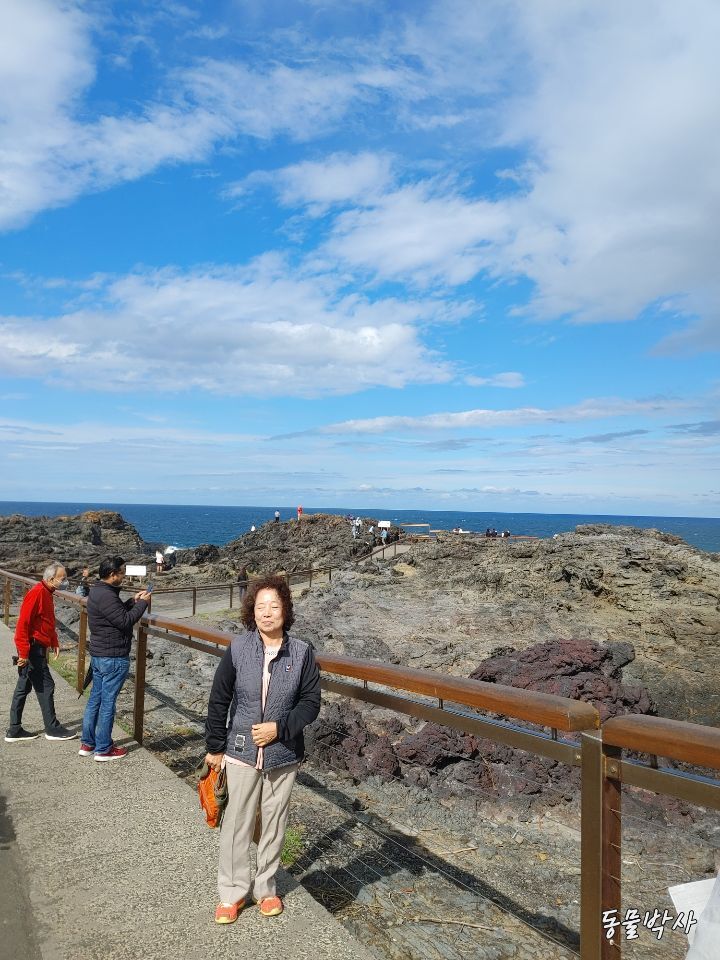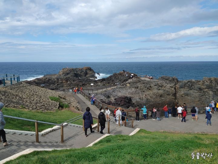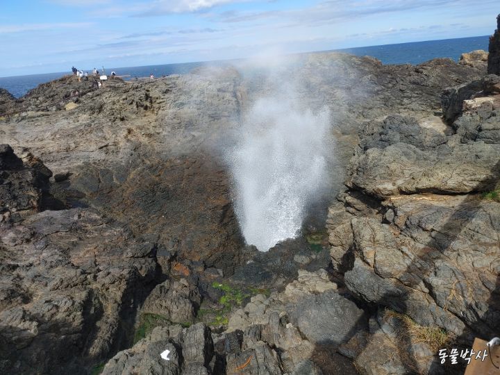 바다에서 물이한번씩 바위사이로 튀어올랐다