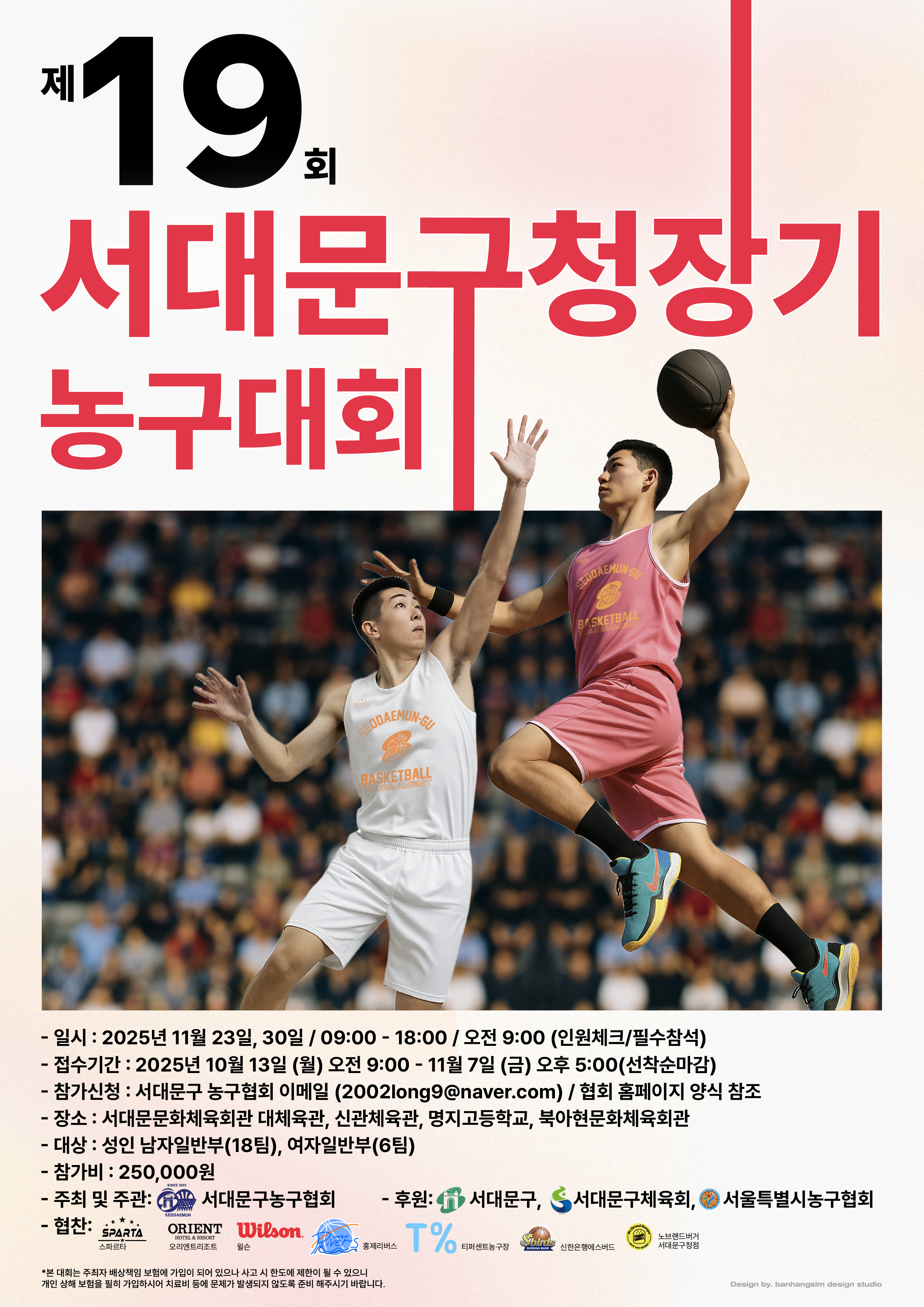 | 제19회 서대문구청장기 농구대회(11/23, 11/30) · 대회개요 - 대회명 : 제19회 서대문구청장기 농구대회 - 일시 : 2025년 11월 23일(일), 11월 30일(일) 장소 : 서대문문화체육회관 대체육관, 신관체육관 명지고등학교, 북아현문화체육센터 주최·주관 : 서대문구농구협회 후원: 서대문구청, 서대문구체육회 협찬 : 스파르타, 오리엔트리조트, 윌슨, 신한은행 에스버드, 홍제리버스, 티퍼센트농구장, 노브랜드 서대문구청점 공인구 : 윌슨 7호볼(5on 5) 종별 : 남자일반부(18팀), 여자일반부(6팀) 대회방식 : 5on 5 / 7분 4쿼터 / 조별리그 본 대회는 주최자배상 보험에 가입 모든 경기 안경 착용 불허 · 대회접수 - 접수방법 · 참가신청서 협회 이메일(2002long9@naver.com)로 송부 (참가신청서 엔트리는 15명 이내) · 참가비 입금 순으로 마감됨. - 접수기간 : 2025년 10월 13일(월) ~ 2025년 11월 7일(금) (선착순 마감) · 대회문의 - 이메일 : 2002long9@naver.com 모든 문의는 서대문구농구협회 카페와 메일을 이용 (http://cafe.daum.net/sudaemunbasketball) · 대표자회의 남자일반부, 여자일반부 대표자 회의 시간: 11/10(월) 저녁 19:30 장소: 서대문 문화체육회관 4층 체육관 · 대회운영 1. 남자일반부 (18개팀) - 경기방식(23일.30일 경기함) · 예선 : 3팀 6조 풀리그 (조 1, 2위 본선 진출- 승수가 많은 팀이 진출하며, 같을 경우 골득실이 높은 팀 우선) · 본선 : 12강 토너먼트, 부전승 (12강 1경기, 12강 6경기) · 7분 4쿼터 / 4쿼터 마지막 2분 데드타임 적용 · 타임아웃 : 전반 1회, 후반 2회 (30초) · 각 팀당 엔트리는 15명까지 참가 가능 · 각 팀 선수출신 출전불가 - 참가팀 · 대한민국농구협회 등록팀 및 비 등록팀 모두 가능 - 적시되지 않은 규정은 공식 FIBA룰에 따른다. 2. 여자일반부 (6개팀) - 경기방식(23일 하루에 경기 끝남) · 예선 : 3팀 2조 풀리그 (조 1, 2위 본선 진출- 승수가 많은 팀이 진출하며, 같을 경우 골득실이 높은 팀 우선) · 본선 : 4강 토너먼트 · 7분 4쿼터 / 4쿼터 마지막 2분 데드타임 적용 · 타임아웃 : 전반 1회, 후반 2회 (30초) · 각 팀당 엔트리는 15명까지 참가 가능 · 각 팀 선수출신(외국인 포함) 2명 출전가능( 쿼터별 1명 잔류) - 적시되지 않은 규정은 공식 FIBA룰에 따른다. · 개회식 - 서대문 문화체육회관 대체육관 오전 09:00(인원체크 및 전원 참석) · 참가비 - 남자일반부(18팀), 여자일반부(6팀) : 참가비 250,000 원 ※ 참가신청서 송부 : 2002long9@naver.com 참가비 입금계좌 : 우리은행 1005-803-640606 서대문구농구협회 (*입금 시 “종별-팀명” 으로 입금 바랍니다. 예시; 여자일반부-SBC, 남자일반부-케페우스) · 시상내역 - 남자일반부(18팀) (우승:트로피, 50만원/부상품(리조트숙박권)/준우승:트로피.30만원,/부상품 (윌슨 농구공) 여자일반부(6팀) (우승:트로피, 30만원/부상품(리조트숙박권)/준우승:트로피.20만원,/부상품(윌슨농구공) |