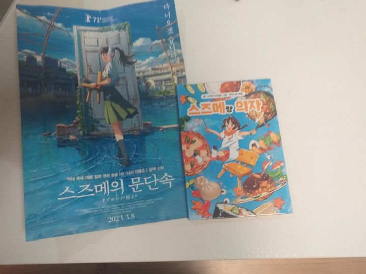 극장가서 어머니와 스즈메의 문단속 보고 사진과보시다시피 영수증 보여주자' 스즈메랑 의자'라는 귀여운책 굿즈받았어요 히히