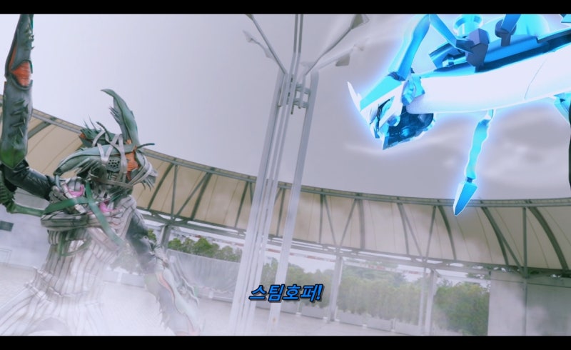 와일드 모드로 순식간에 접근해서 제로 거리에서 변형, 그대로 킥으로 이어지는 필살기, 스팀호퍼 피버입니다