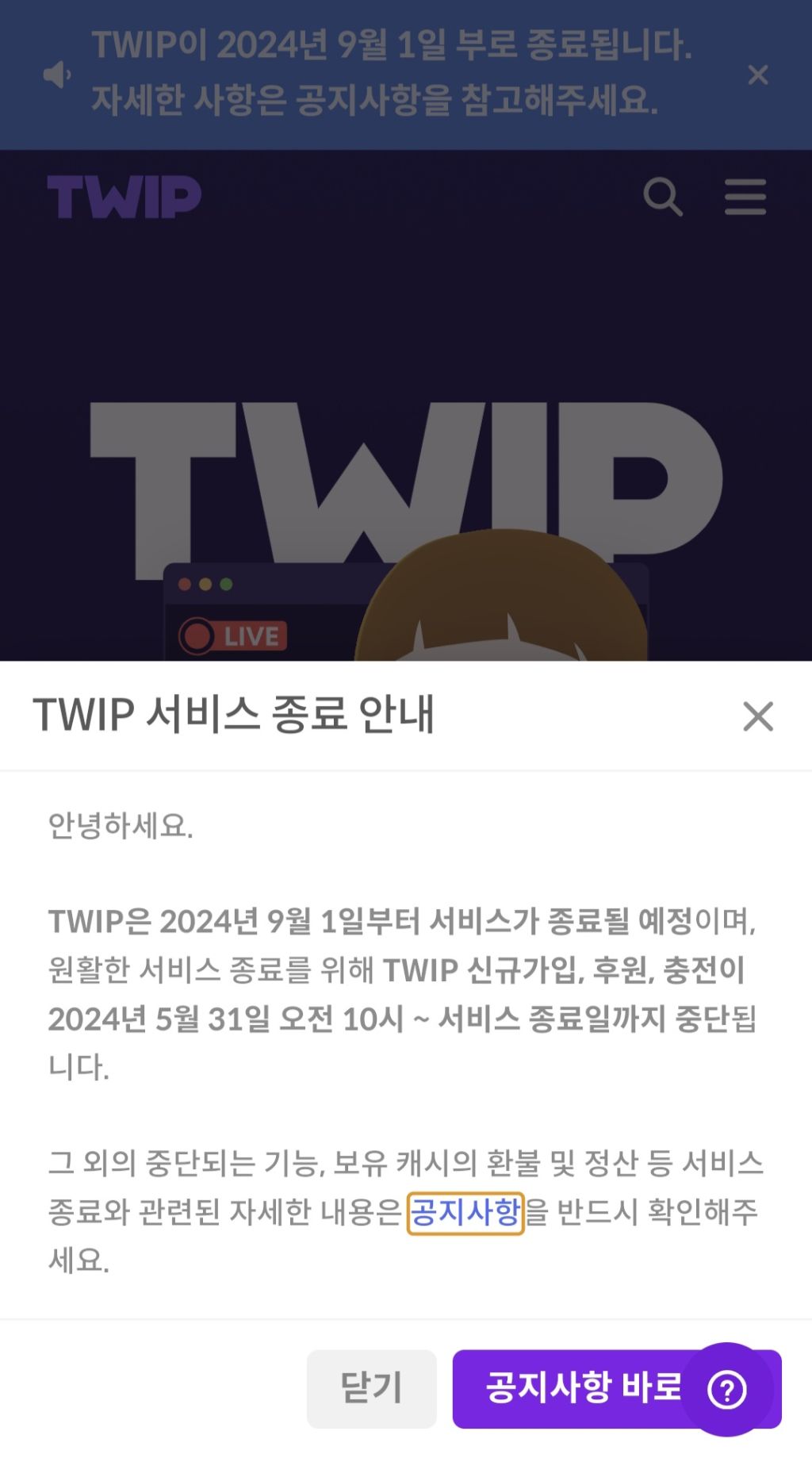 트윕 서비스 종료한다는데요..? 작성자성아ㆍ|작성시간24.05.31|조회수263 목록 댓글 6 글자크기 작게가 글자크기 크게가 공지사항⬇️⬇️⬇️https://support.twip.kr/hc/ko/articles/33062803441305-TWIP-%EC%84%9C%EB%B9%84%EC%8A%A4-%EC%A2%85%EB%A3%8C-%EC%95%88%EB%82%B4 다음검색 현재 게시글 추가 기능 열기 북마크 공유하기 신고 센터로 신고 댓글 댓글 6 댓글쓰기 답글쓰기 댓글 리스트 답댓글 작성자성아ㆍ 작성자 본인 여부 작성자 | 작성시간 24.05.31 오늘 공지가 올라옴과 동시에 후원이 막혔어요 작성자너굴은 동린이 | 작성시간 24.05.31 ? 작성자너굴은 동린이 | 작성시간 24.05.31 전군!! 꿀을 탕진해라!! 작성자e니나 | 작성시간 24.05.31 아씨 안돼 내 tts 도네 내놔!!! 작성자소악마_한이윤 | 작성시간 24.06.01 왜 다 문 닫아......... 댓글 전체보기
