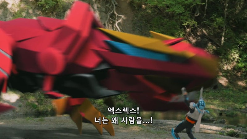 시작부터 공룡과 싸우고 있는 가면라이더 갓챠드. 상대는 또 하나의 레벨10 케미, 엑스렉스입니다