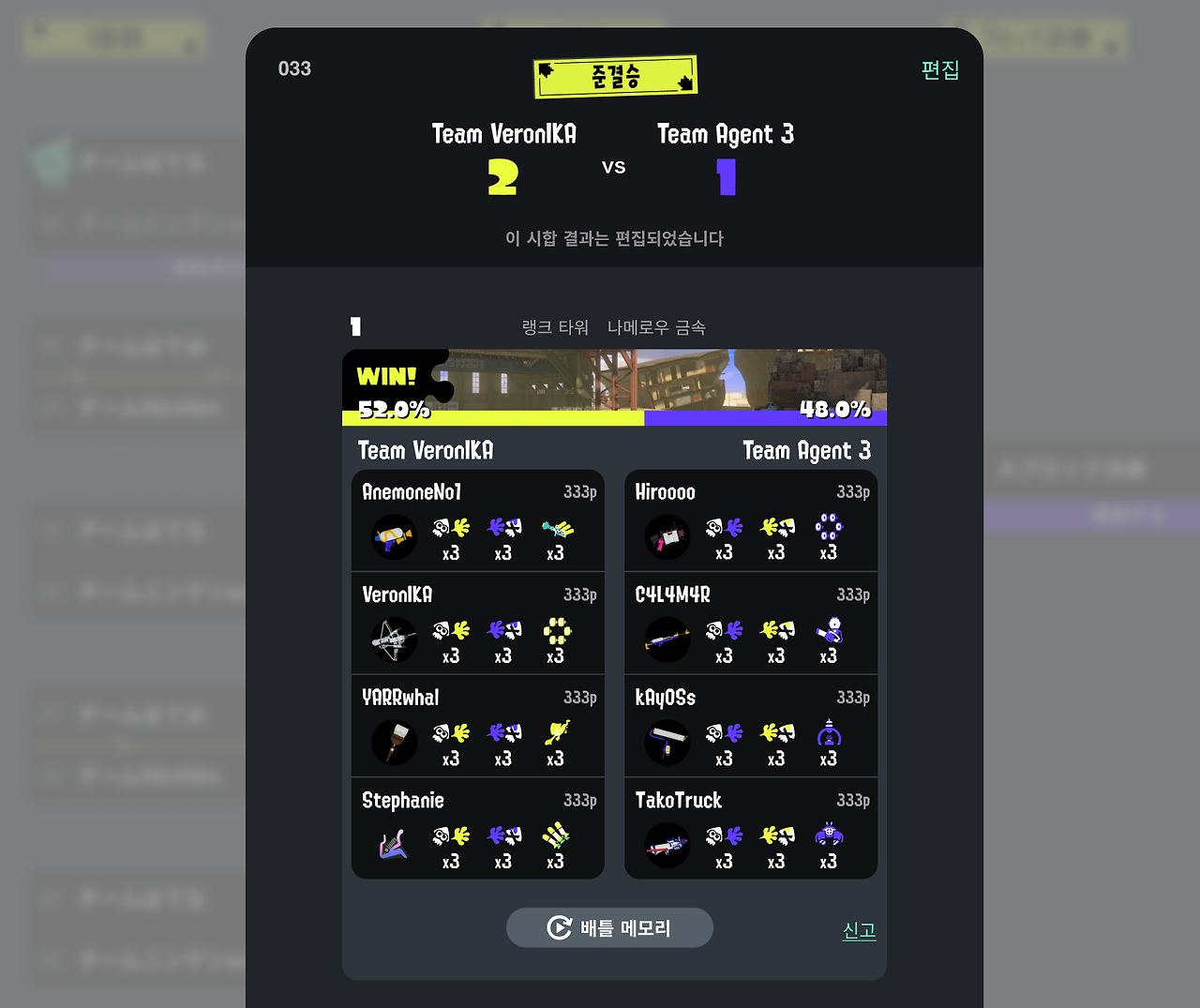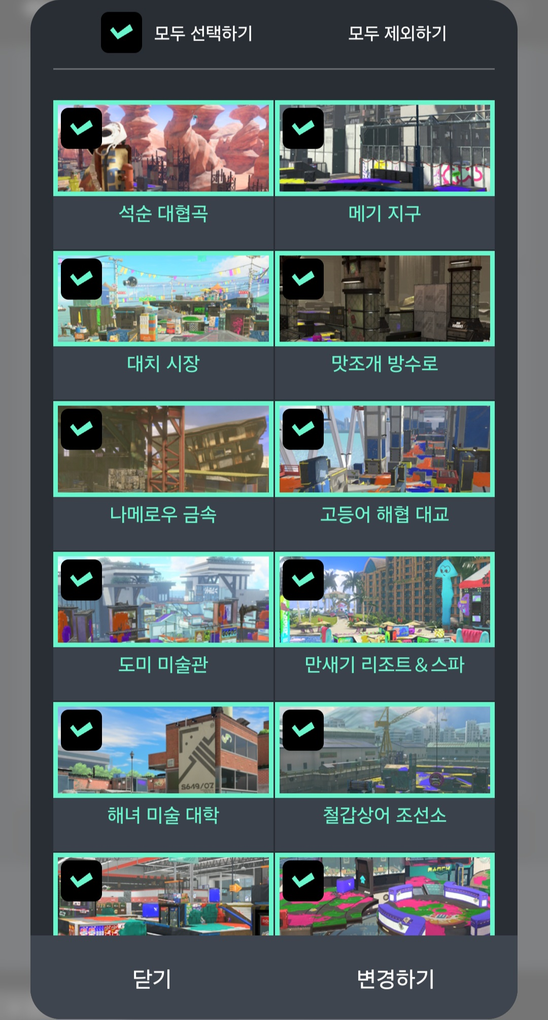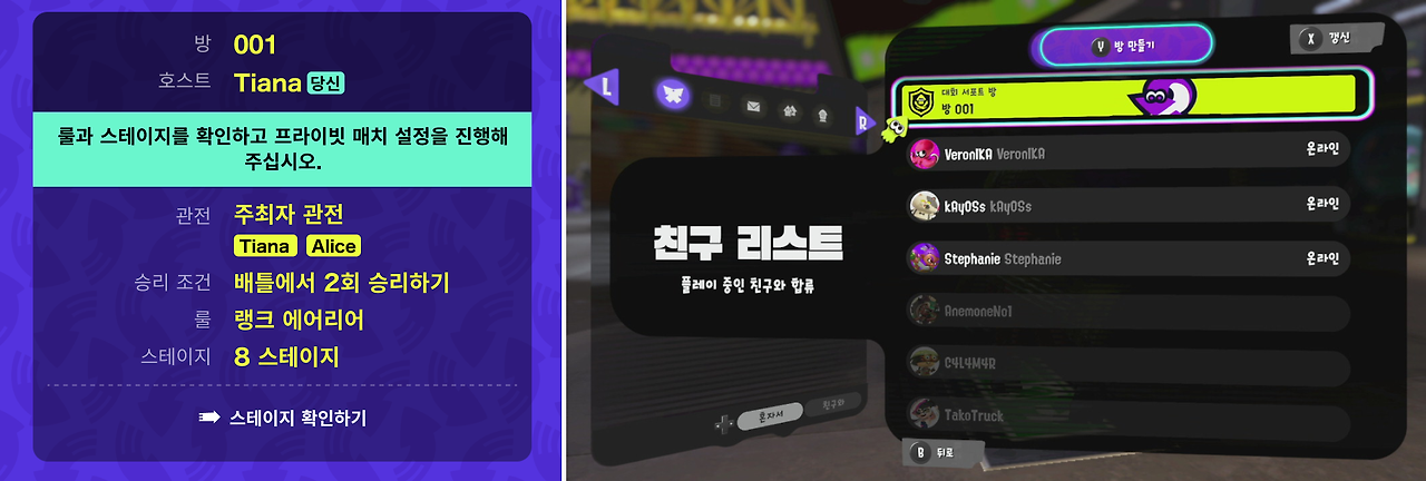 룰은 영역배틀,랭크에어리어,랭크타워,랭크피시,랭크바지락중에 선택 가능해요