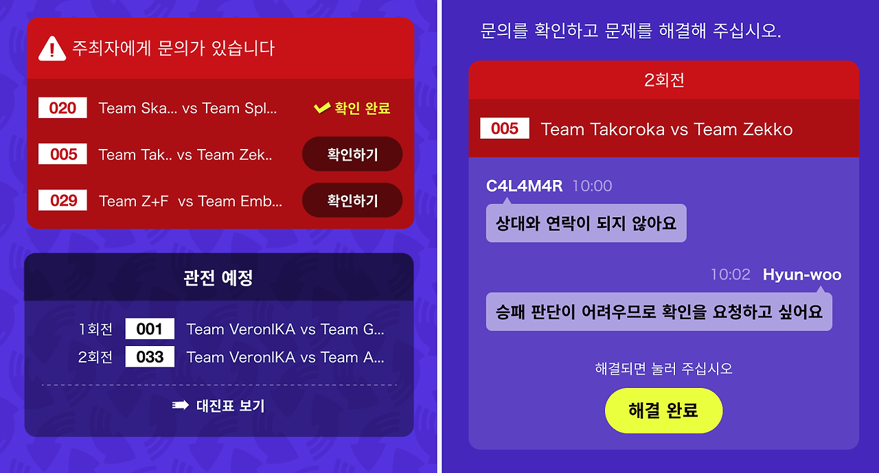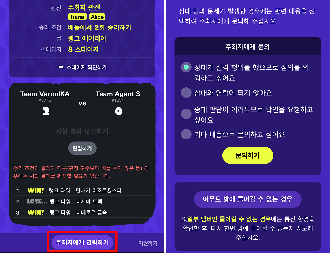 하다가 튕기거나 반칙이 있거나 할때 주최자에게 연락해서 문제제기를 하고