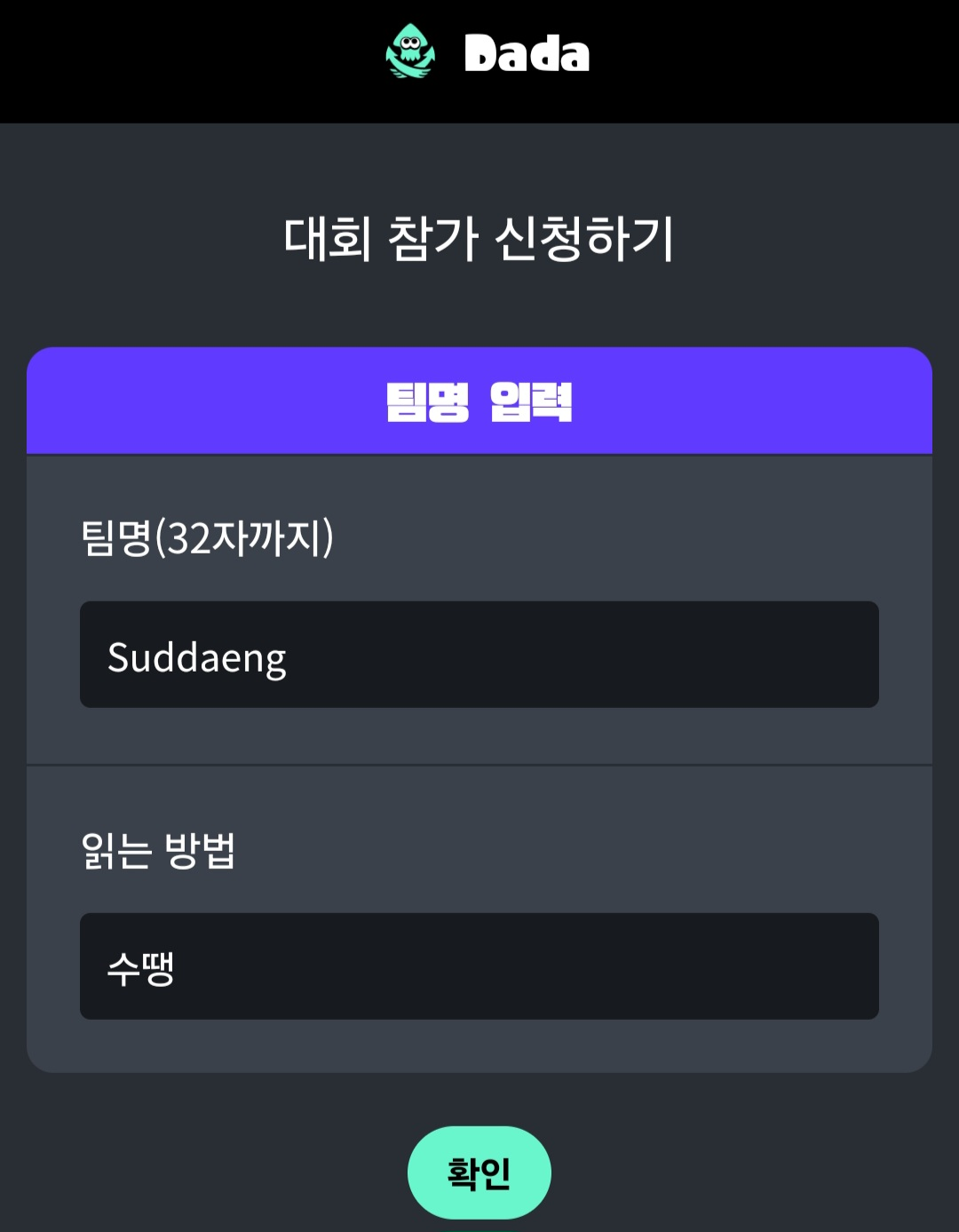 이런식으로 팀명과 읽는 방법을 써서 확인을 누르고 참가신청을 하시면 됩니다