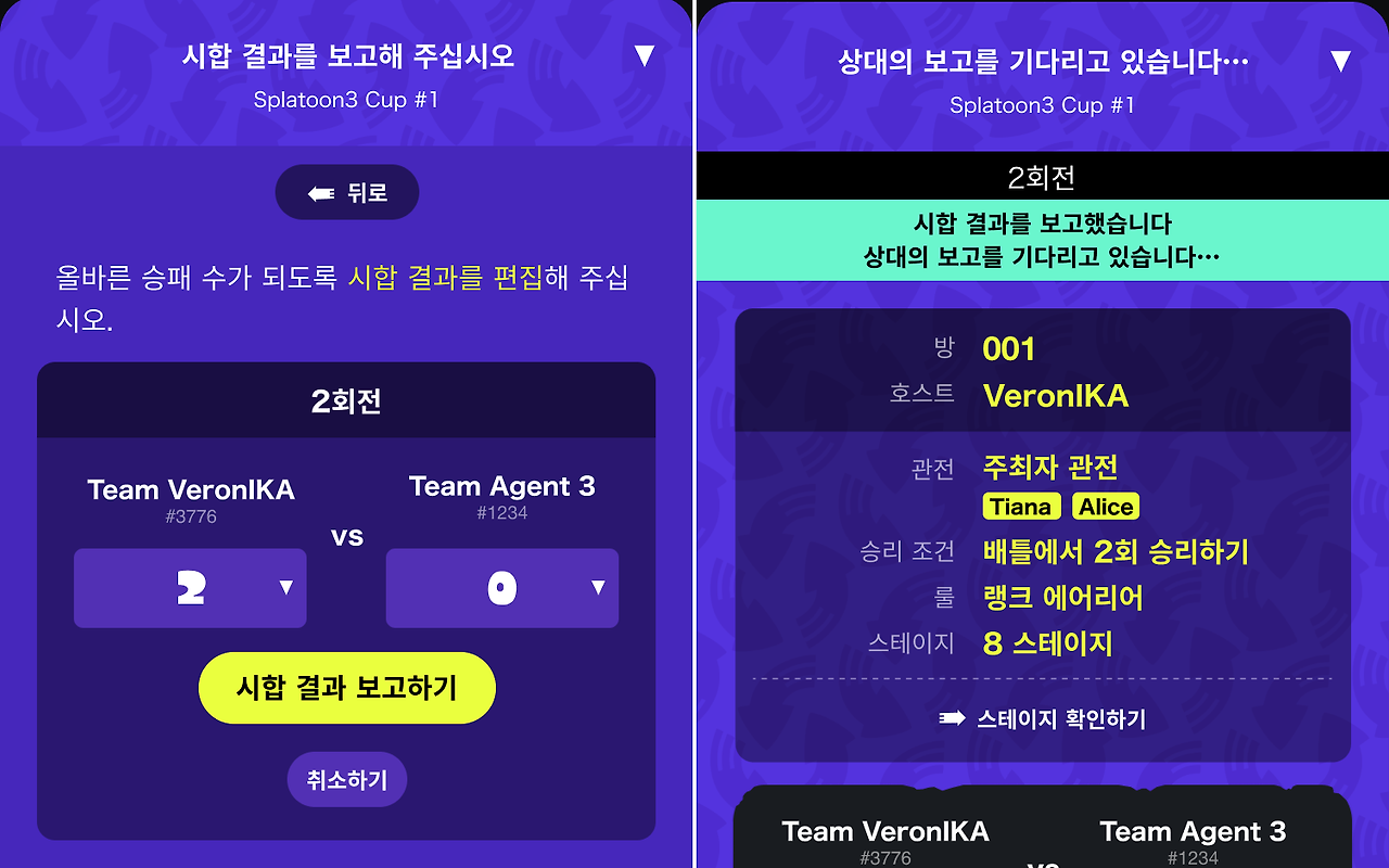 두 팀의 캡틴이 동일한 결과를 보고한다면 대진표에 적힌답니다