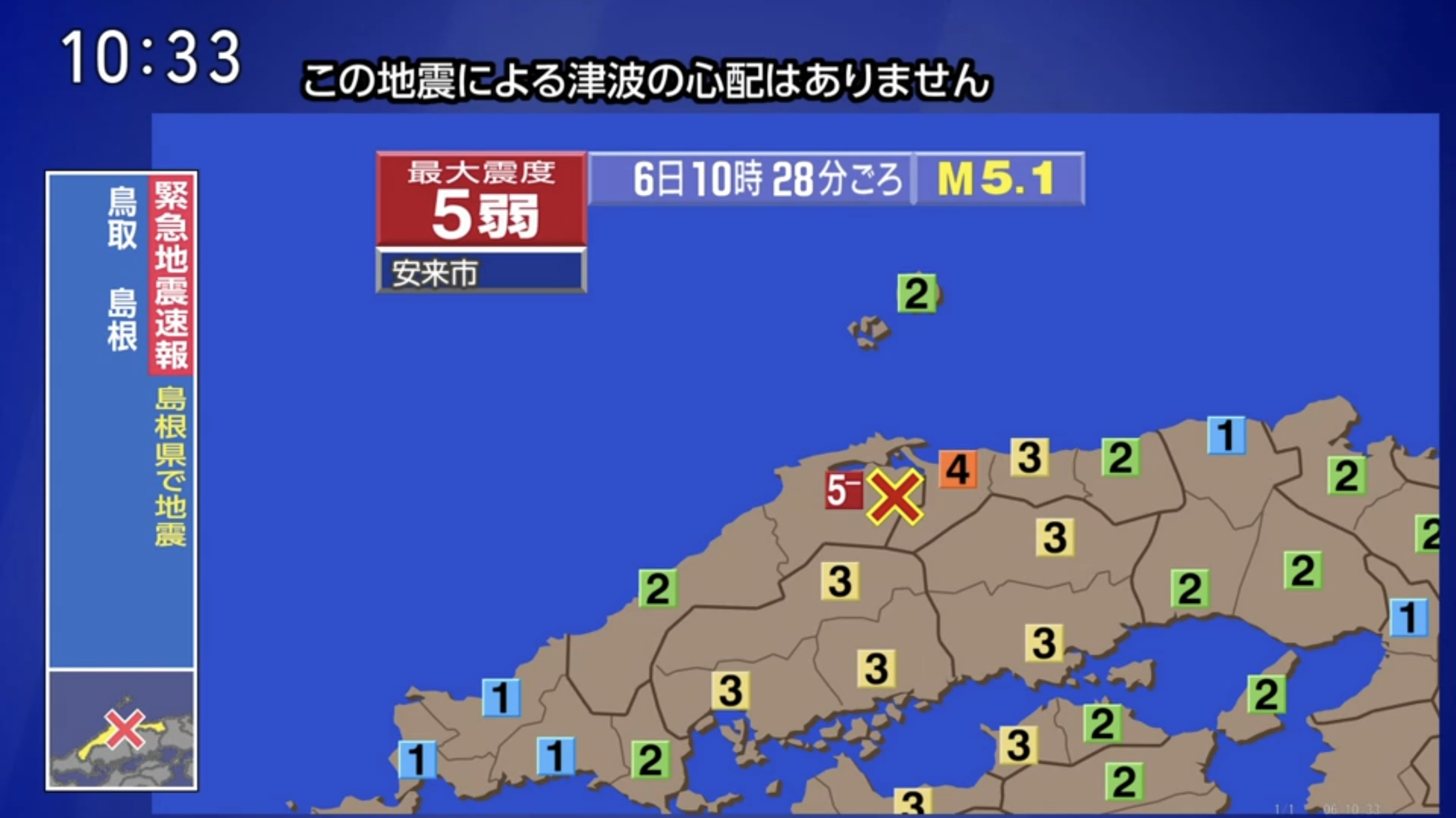 두번째로 긴급지진속보가 발령된 지진으로 시마네현 야스기시에서 최대진도 5-가 관측되었습니다. 진원은 시마네현 동부, 깊이는 10km, 지진의 규모를 나타내는 매그니튜드는 M5.1입니다.