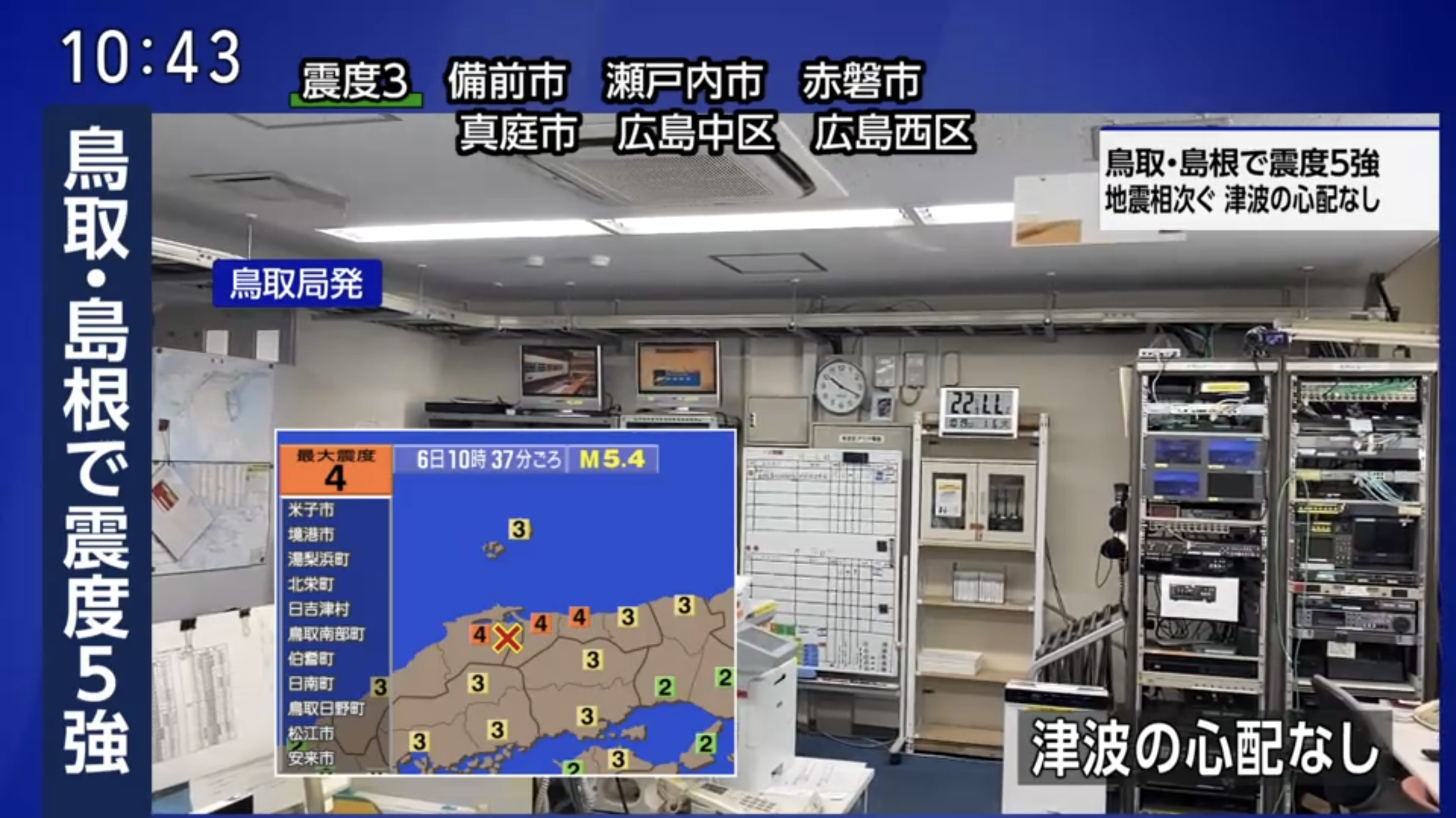 추가 긴급지진속보입니다. 대상 지역은 오카야마현, 히로시마현, 돗토리현, 시마네현입니다.