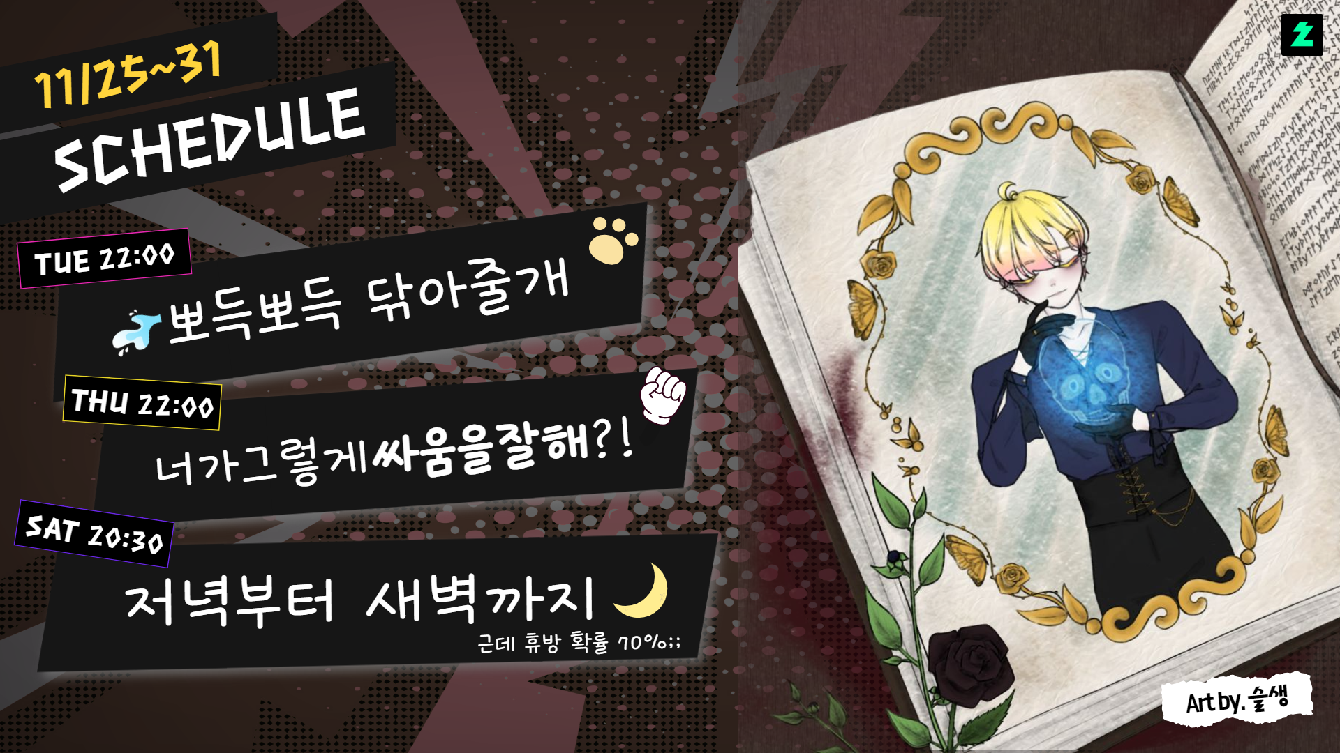 【11월 5주 방송 스케쥴 : 너가 그렇게 싸움을 잘해?!👊】 작성자수땡이|작성시간24.11.25|조회수150 목록 댓글 10 글자크기 작게가 글자크기 크게가 덤벼! (퍽퍽) 다음검색 현재 게시글 추가 기능 열기 북마크 공유하기 신고 센터로 신고 댓글 댓글 10 댓글쓰기 답글쓰기 댓글 리스트 작성자감자동물원지박령아담이브 | 작성시간 24.11.26 가자. 이미지 확대 작성자suji1201 | 작성시간 24.11.26 토요일 휴방 70% 감사합니다~ 작성자슬생54 | 작성시간 24.11.26 아 토요일 휴방이라구요? ㅎㅇ~ 작성자지아커 | 작성시간 24.11.26 토요일에 꿀잠 각이다 작성자너굴은 동린이 | 작성시간 24.11.26 방금.. 싸움이라고... 하였는가....? 이미지 확대 댓글 전체보기