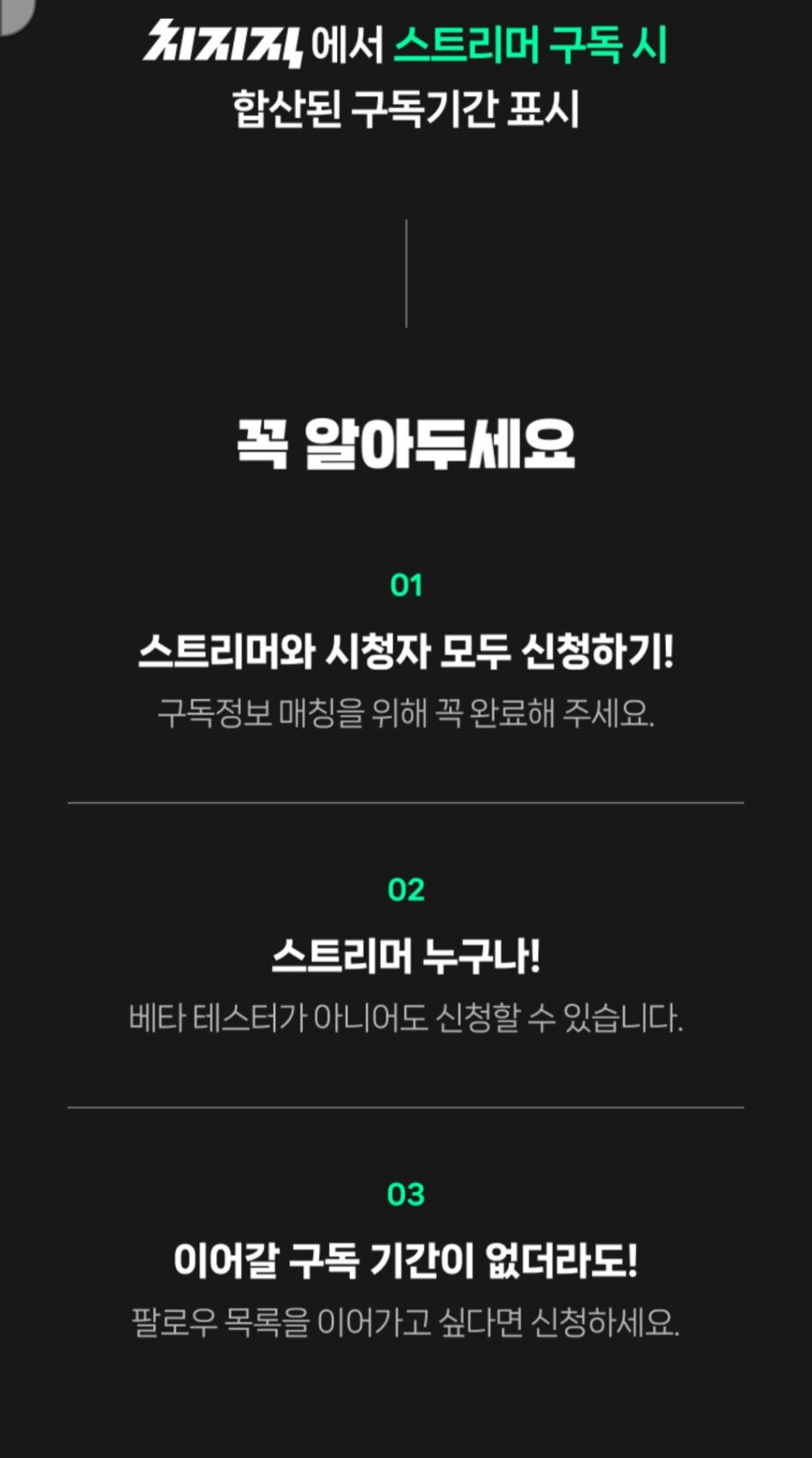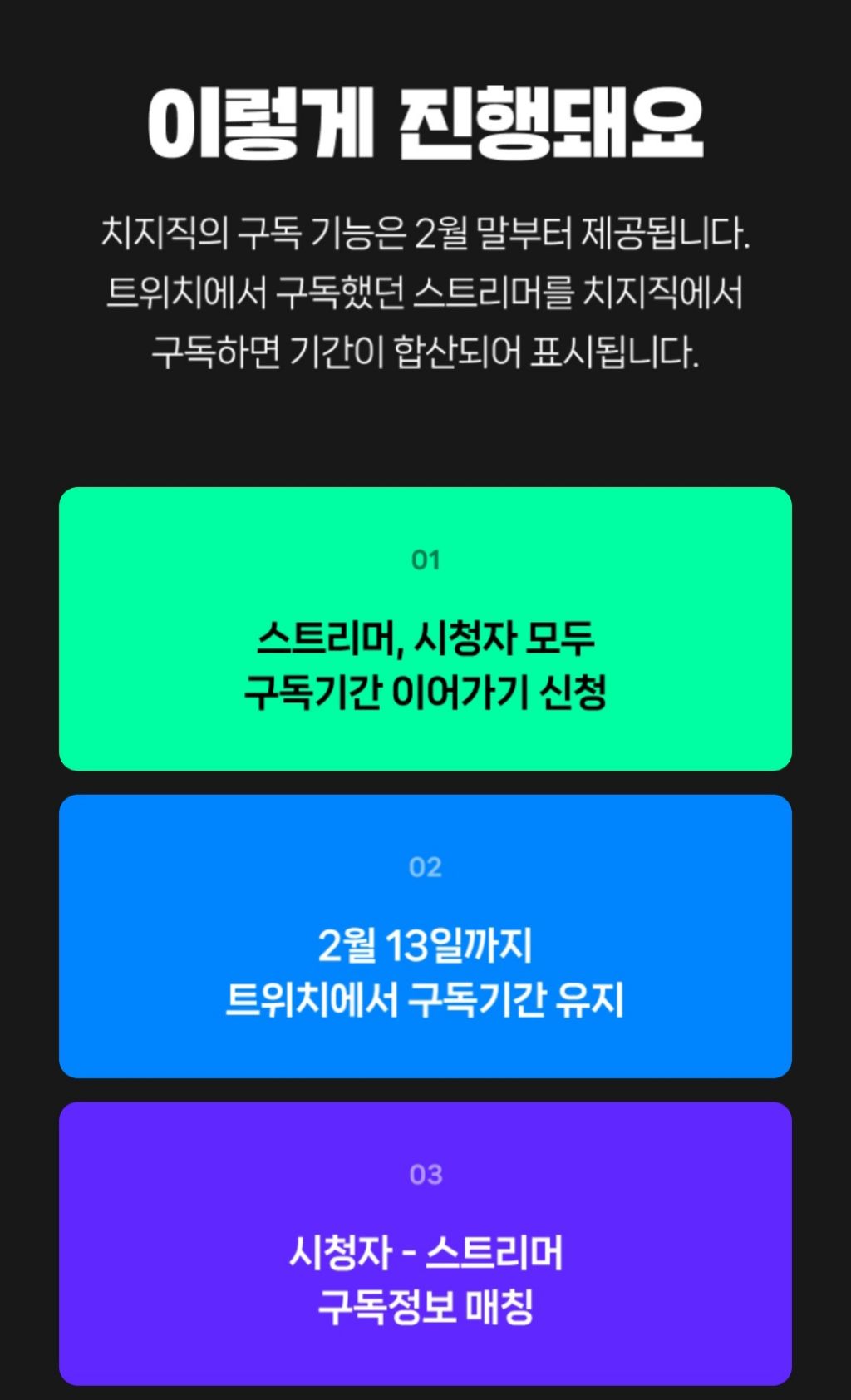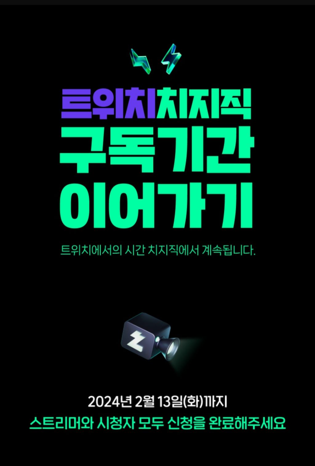 치지직 구독기간 이어가기(팔로우 포함) 작성자suji1201|작성시간24.01.09|조회수523 목록 댓글 0 글자크기 작게가 글자크기 크게가 이어갈 구독 기간이 없더라도 팔로우 목록을 이어가고 싶다면 신청하세요 나온 걸 보니 팔로우도 옮겨가나봐요..저는 신청완료!!♡♡https://naver.me/F0tmbrJx치지직-트위치 구독기간 이어가기 캠페인이 시작되었습니다! : 치지직치지직-트위치 구독기간 이어가기 캠페인이 시작되었습니다! : 치지직game.naver.com 다음검색 현재 게시글 추가 기능 열기 북마크 공유하기 신고 센터로 신고 댓글 댓글 0 댓글쓰기 답글쓰기 댓글 리스트