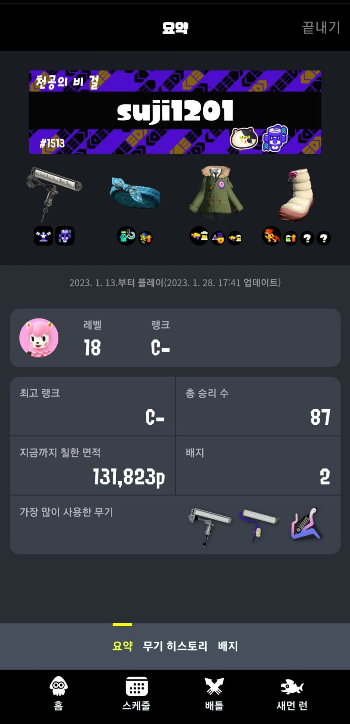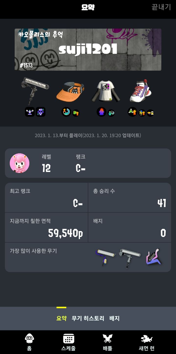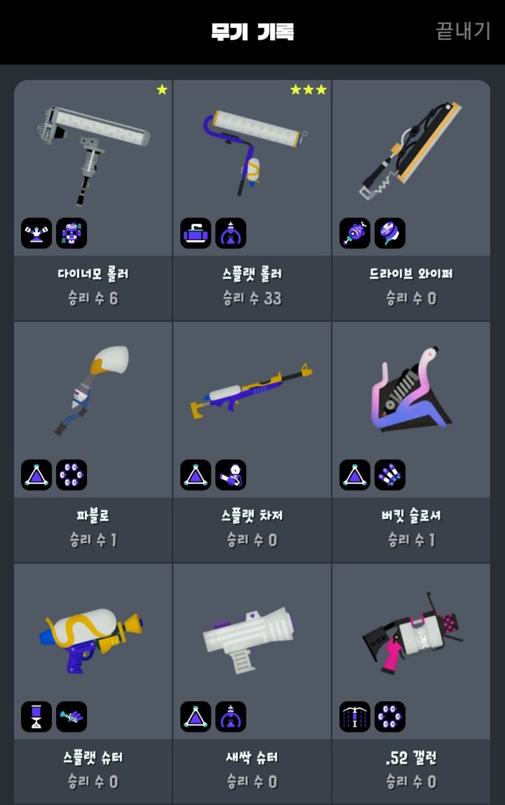 현재 소지중인 무기 입니다 닌텐도 스위치 온라인 어플에서 확인한 것이예요^^(20일 기준)