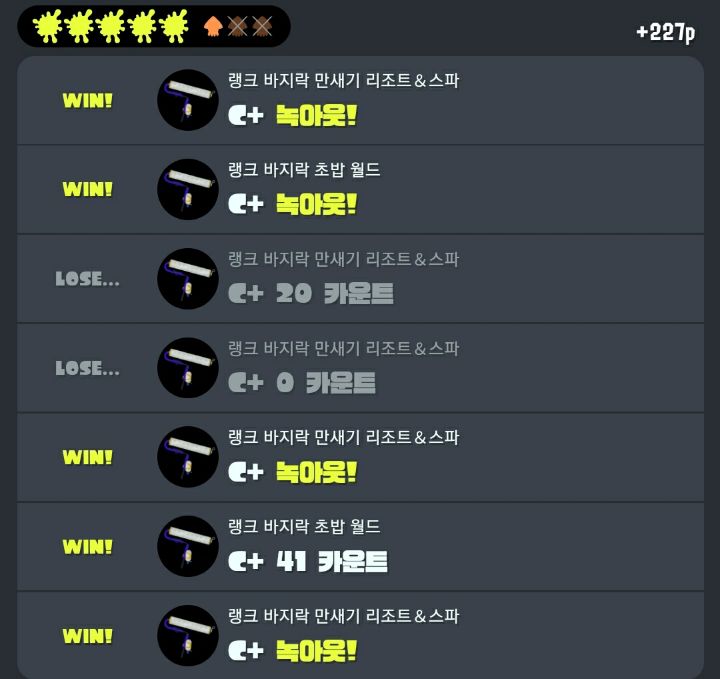 랭크 바지락만 7전 5승 2패를 기록해 227점을 얻었습니다!