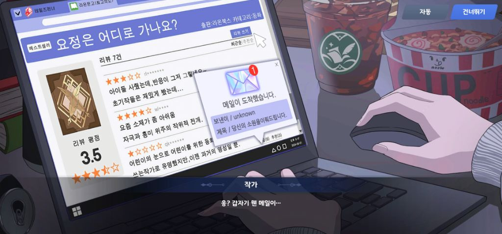 플레이어는 게임 내에서는 작가라는 호칭으로 불리는데요 작가에게 소원을 이뤄준다는 메일이 오면서 다른 세계에 들어가게 됩니다