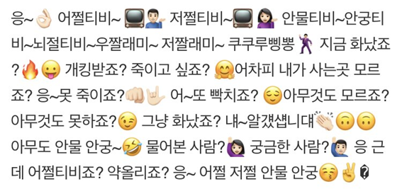 근데 그걸 누가 궁금해했나? 어쩔티비 저쩔티비 안물안궁 화났죠? 개킹받쥬? 죽이고 싶쥬? 근데 사는곳 모르쥬? 못 죽이쥬? 어~ 또 빡치쥬? 아무고또 모르쥬? 아무고또 모타쥬? 그냥 화났쥬? -