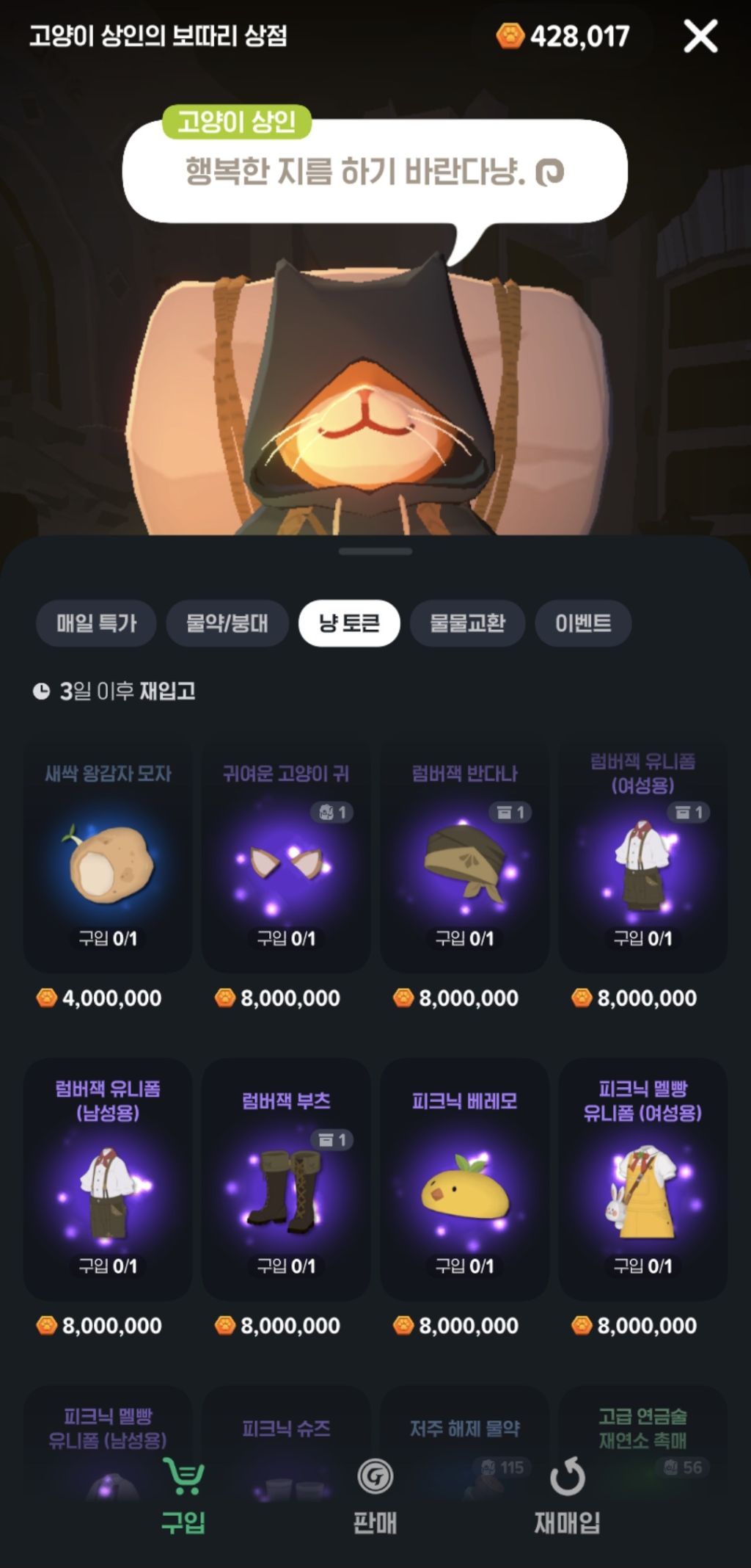 냥토큰으로 살 수 있는 옷이 다양해졌어요
