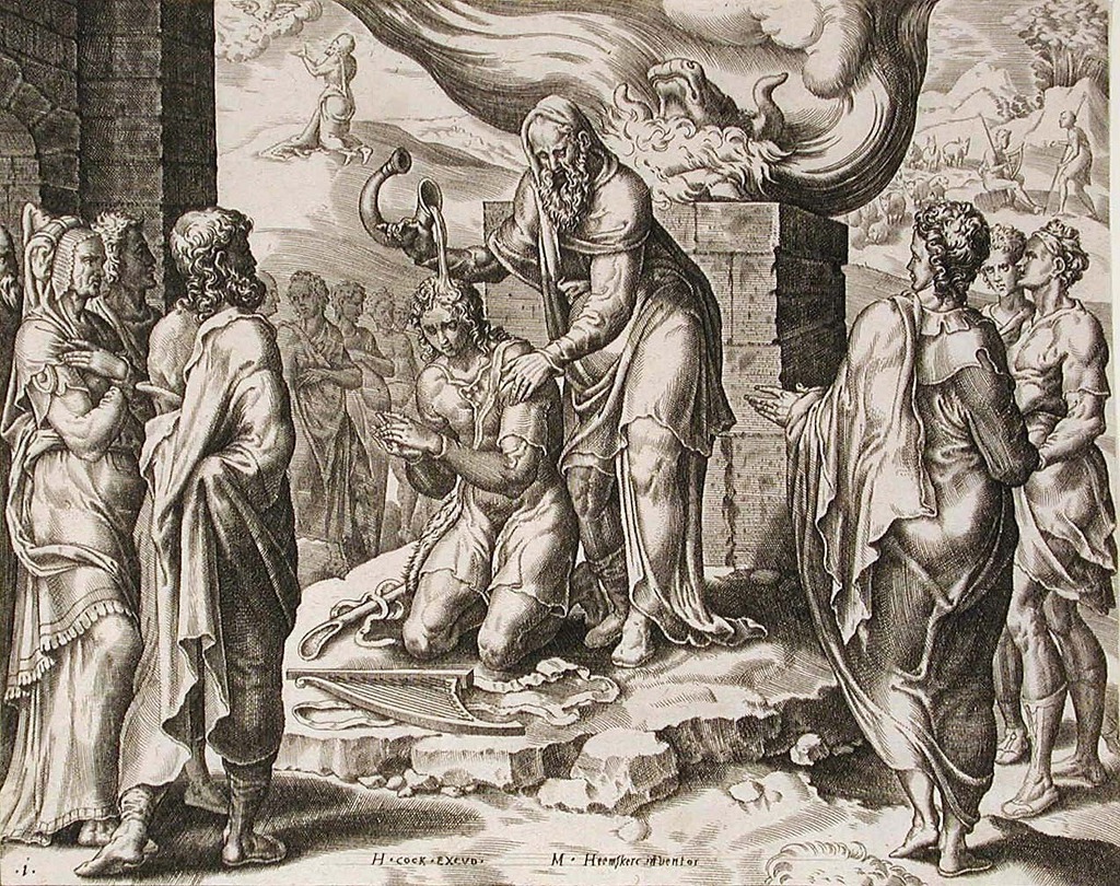 헴스케르크, 사무엘이 다윗에게 기름붓다, Maerten van Heemskerck, Samuel Anoints David, 1556, Ink engraving