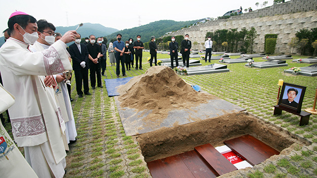 지난 9월 5일 안성추모공원 내 성직자 묘역에서 문희종 주교 주례로 고(故) 이호권 신부 무덤 축복식 및 하관 예식이 거행되고 있다. 하관 예식을 통해 고통 중에서도 하느님 은총이 넘치는 나라를 기도하고 희망할 수 있다.