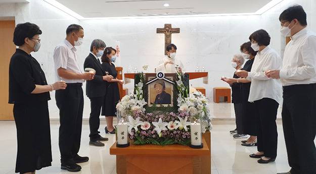 입관 후 바치는 기도는 이스라엘 백성이 체험한 사건들을 보며 하느님께서 당신 백성을 어떻게 인도하셨는지 신앙 안에서 재현한다는 의미가 있다. 사진은 8월 22일 봉헌된 고(故) 강성남 여사 장례미사. 고인은 평생 마련한 25억 원 상당 부동산을 지난 2000년 가톨릭대학교에 기부했다. 가톨릭대 홍보팀 제공