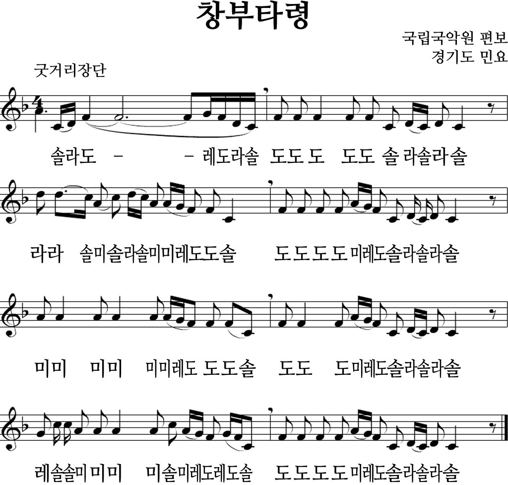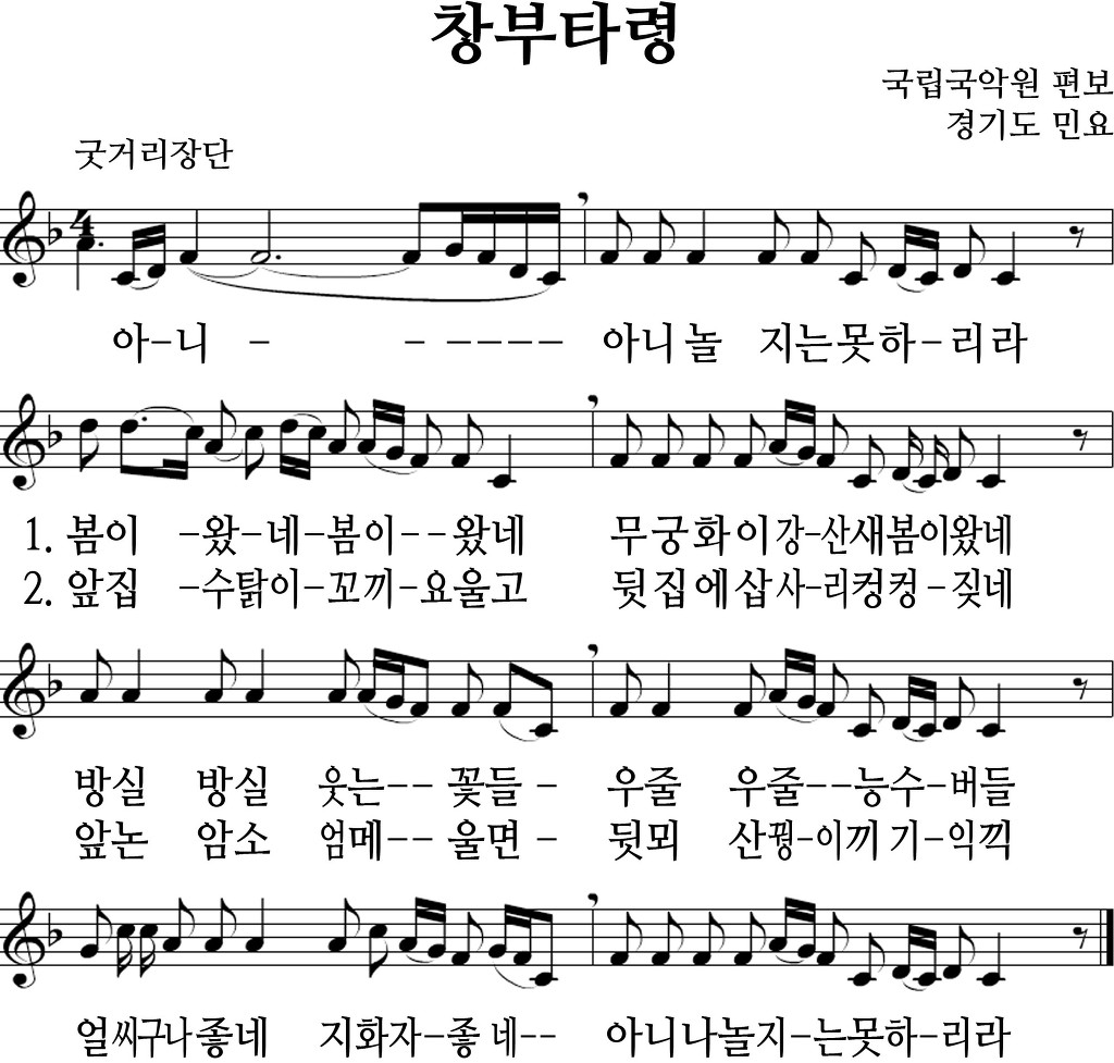 경기민요의 대부분이 5음 음계의 평조선법(平調旋法)으로 되어 있고, 흥겹고 멋스러운 굿거리장단으로 된 민요가 많은데, 「창부타령」 역시 이와 같은 노래인 것이다.