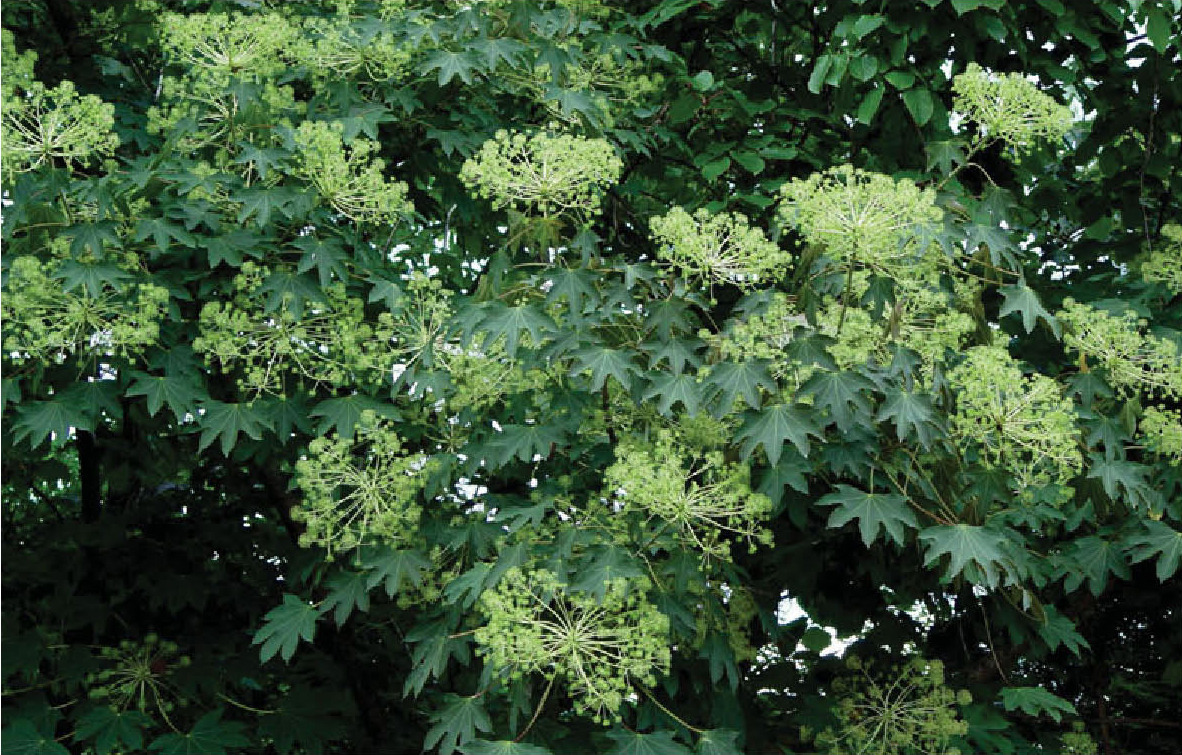 음나무는 물갈퀴가 달린 오리발처럼 생긴 커다란 잎이 특징이다. 옛사람들은 오동나무 잎과 비슷한데 가시가 있다는 뜻으로 자동(刺桐)이라 했다. 다른 이름인 해동목(海桐木) 역시 오동나무 잎을 비유한 이름이다. 키 20미터, 줄기둘레가 두세 아름에 이를 수 있으며 자람 속도도 굉장히 빠르다. 음나무 껍질은 해동피(海桐皮)라고 알려진 약재다. 《동의보감》에는 “허리나 다리를 쓰지 못하는 것과 마비되고 아픈 것을 낫게 한다. 적백이질, 중악과 곽란, 감닉, 옴, 버짐, 치통 및 눈에 피가 진 것 등을 낫게 하며 풍증을 없앤다”라고 했다.