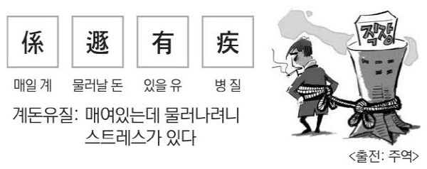 현실적으로 힘든 일상을 보내는 우리들이 가끔 현실을 벗어나고 싶을 때가 있어도 현실에 매여 그렇게 하지 못하는 경우가 종종 있다. 이런 경우를 계돈(係遯)이라 할 수 있다. 한편으로는 매여있는데 물러나려하고 물러나고 싶은데 매여있으니 이런 상태에서는 스트레스를 받게 된다. 그래서 유질(有疾)이라 한다. 주역에서 이럴 때는 자신의 욕구를 누르고 힘들더라도 그 자리를 지켜야지 함부로 뛰쳐나가봤자 자신이 욕구하는 그림을 성취하기 힘들다고 충고한다. 현대 직장인들이 받는 스트레스를 잘 표현해주는 말인 듯하다.
