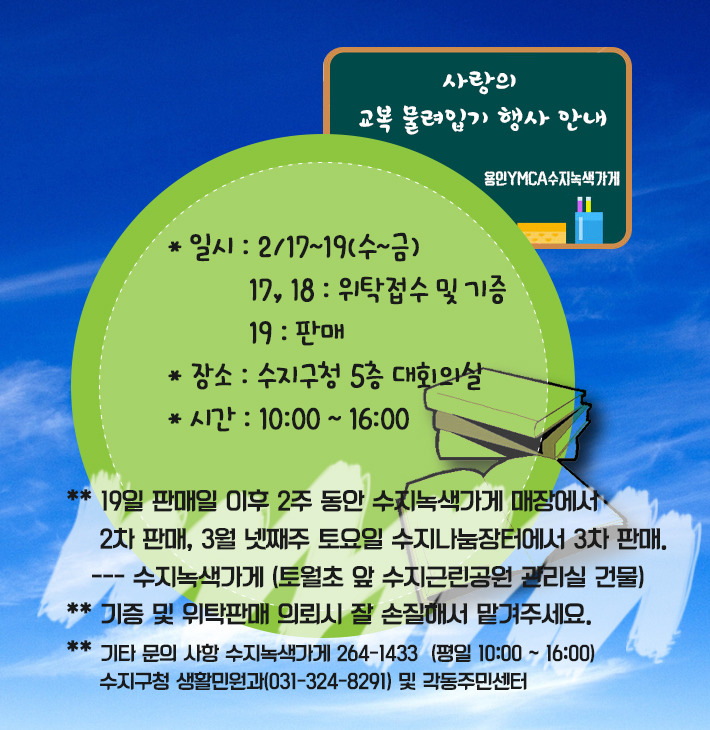 2016년 교복 물려입기 행사 안내 작성자miae|작성시간16.01.28|조회수87 목록 댓글 0 글자크기 작게가 글자크기 크게가 다음검색 현재 게시글 추가 기능 열기 북마크 공유하기 신고 센터로 신고 댓글 댓글 0 댓글쓰기 답글쓰기 댓글 리스트
