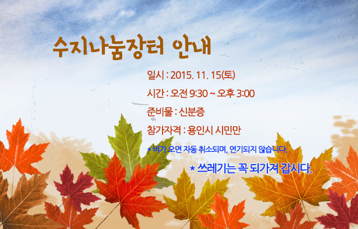 2015. 11. 15(토) 수지 나눔장터 행사 안내 작성자miae|작성시간15.11.10|조회수338 목록 댓글 0 글자크기 작게가 글자크기 크게가 다음검색 현재 게시글 추가 기능 열기 북마크 공유하기 신고 센터로 신고 댓글 댓글 0 댓글쓰기 답글쓰기 댓글 리스트